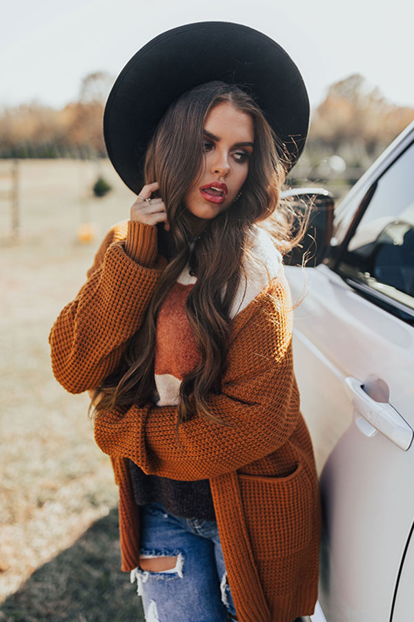 Adventure in style with our darling warm pumpkin colored "Fall Hike" cardigan featuring soft lightweight material with waffle knit texturing, long loose sleeves with fitted cuffs, low accent side pockets, and an ultra slouched open front silhouette that ends in a straight hemline! Measurements