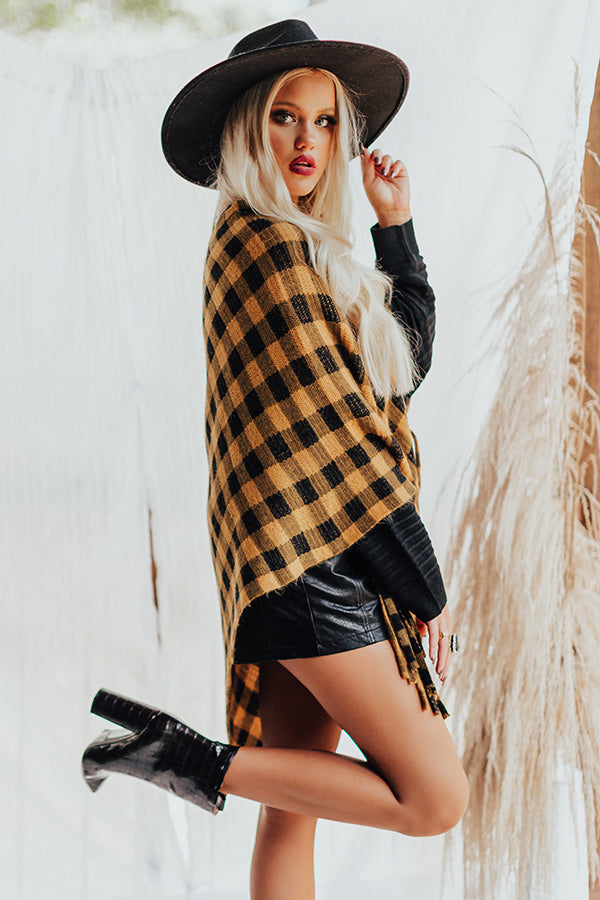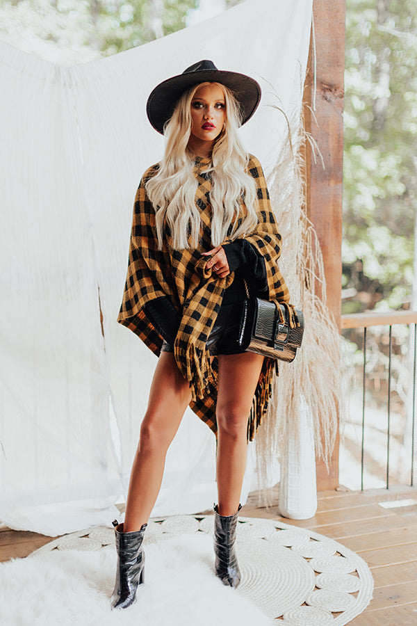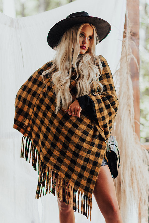 Effortlessly layer up in our beautiful "Fall In Vermont" poncho featuring soft lightweight tight knit material patterned with a black and golden honey colored buffalo check print, a high rounded neckline, and an ultra draped silhouette with open sides, and a pointed hemline with tassel trim detailing! Measurements