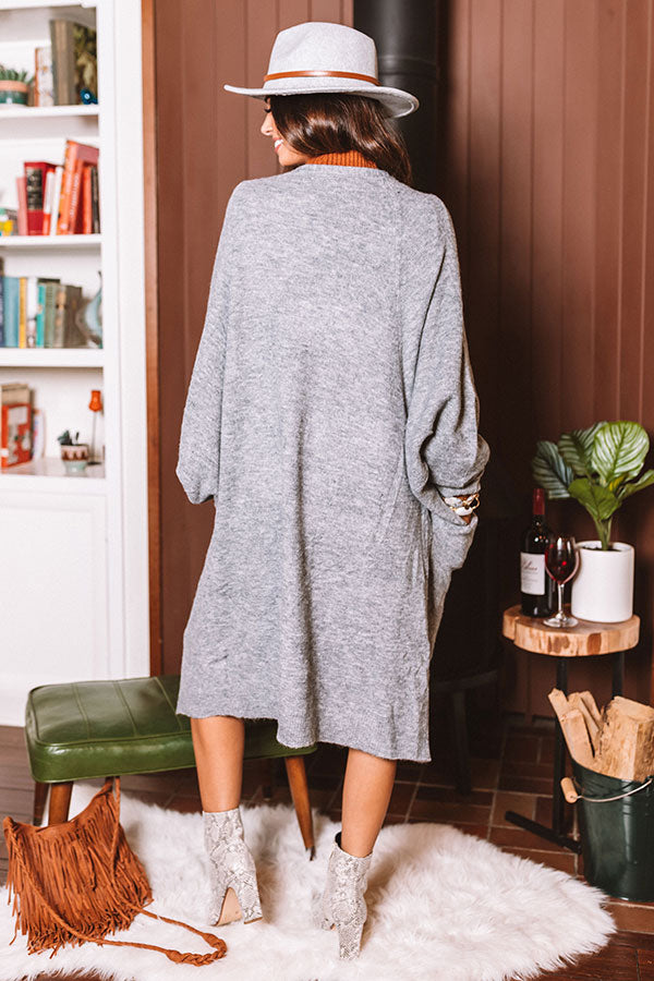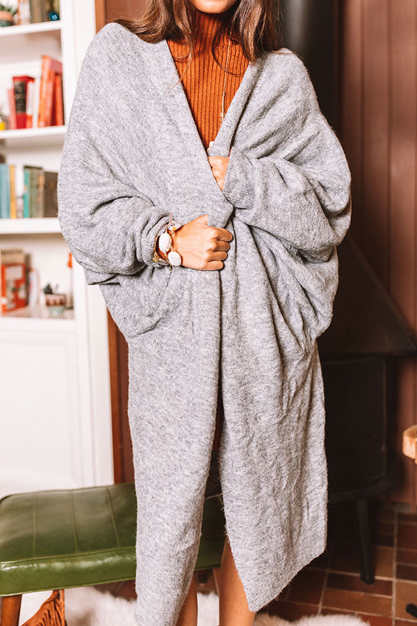 Snuggle up for those crisp fall mornings in this charming grey duster cardigan featuring soft lightweight tight knit material, long oversized bat wing sleeves with fitted cuffs, and an ultra draped open front silhouette hat falls into a straight knee-length hemline! Measurements
