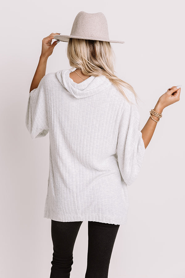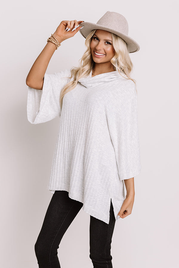 There is no better piece to thrown on a go for an effortless "fall morning" than this adorable cream colored sweater featuring soft lightweight tight knit material with vertical ribbed texturing, a draped turtle neckline, oversized 3/4-length sleeves, and an ultra slouched silhouette that cascades into a straight tunic-length hemline with accent side slits! Measurements