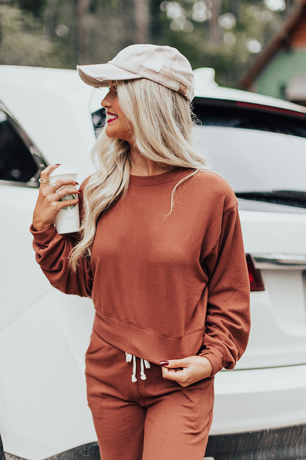 Stay warm during those chilly "fall nights" with this adorable cinnamon colored sweatshirt featuring soft lightweight material, a high rounded neckline, long loose sleeves with fitted cuffs, and a relaxed silhouette that falls into a straight hemline! Measurements