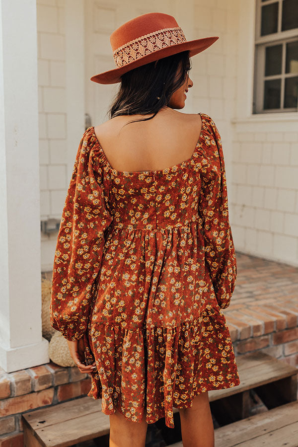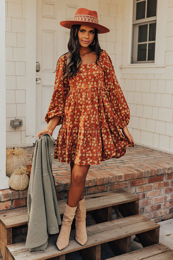 We're feeling fall vibes with this adorable babydoll dress! Features lightweight rust colored material with a floral pattern, a wide square neckline, back zip closure, long loose sleeves with elastic cuffs, and a relaxed silhouette that falls into a straight mid-thigh length hemline.
