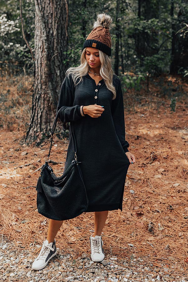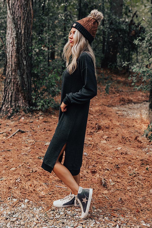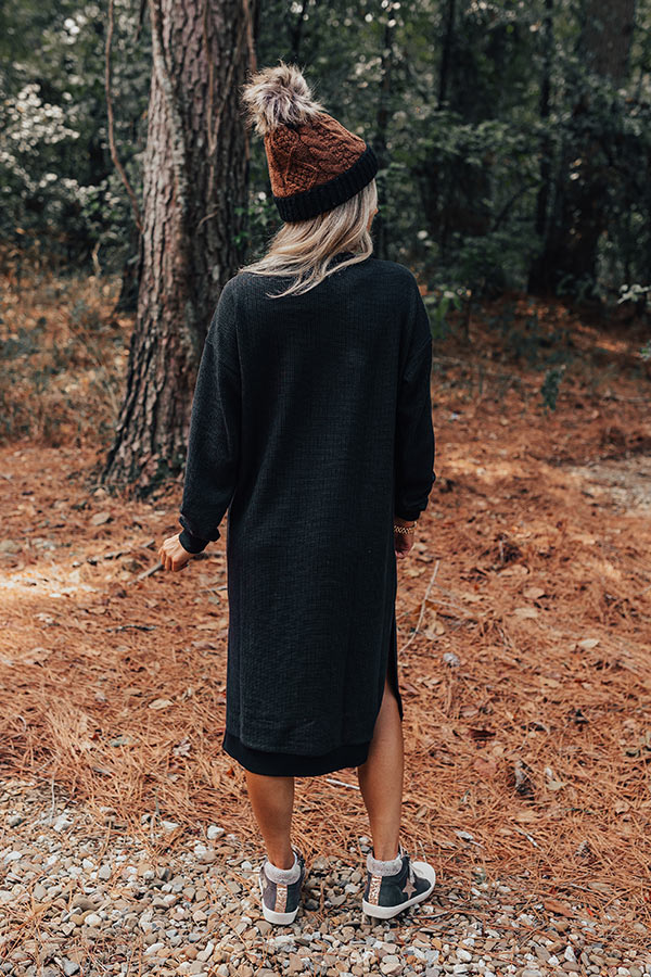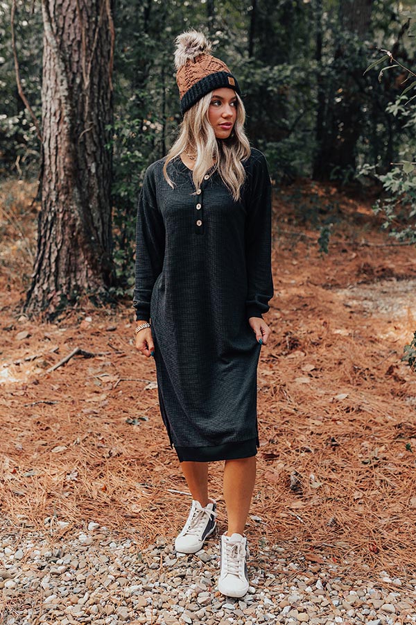 - A relaxed silhouette that ends in a straight midi length hemline with a ribbed texture and side slit accents