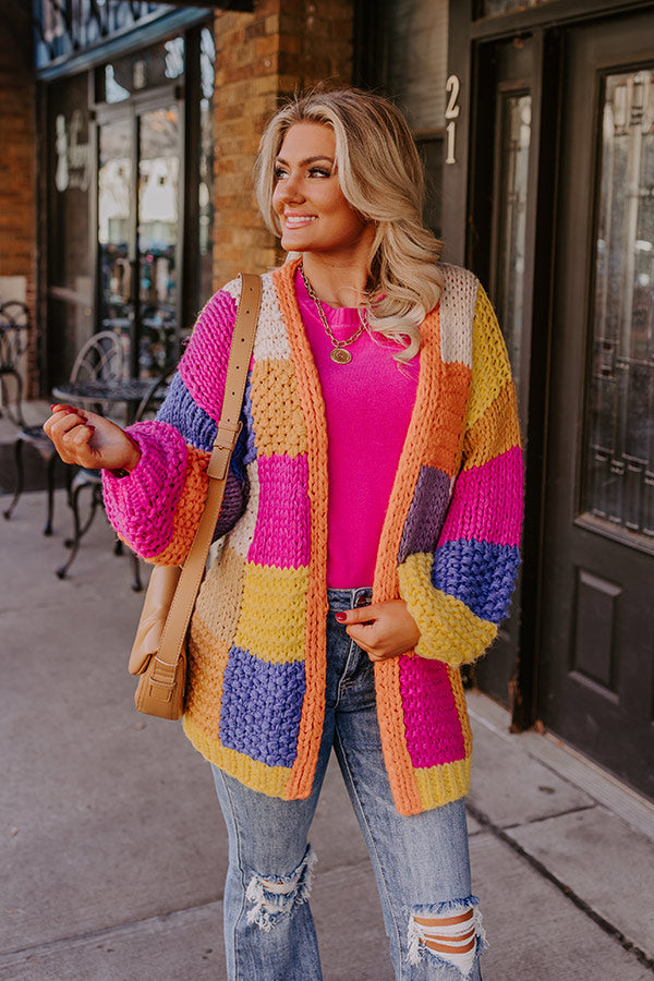 - Unlined chunky knit material featuring yellow, blue, orange, pink, purple, and brown hues