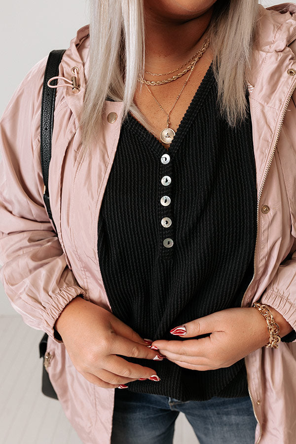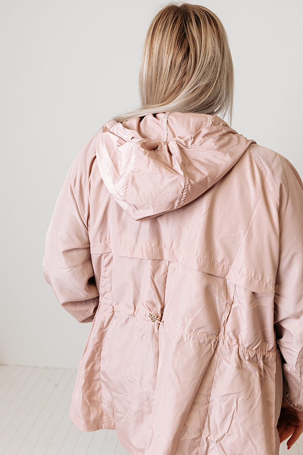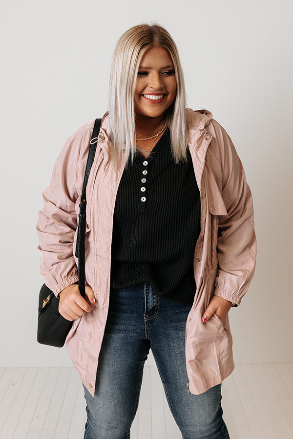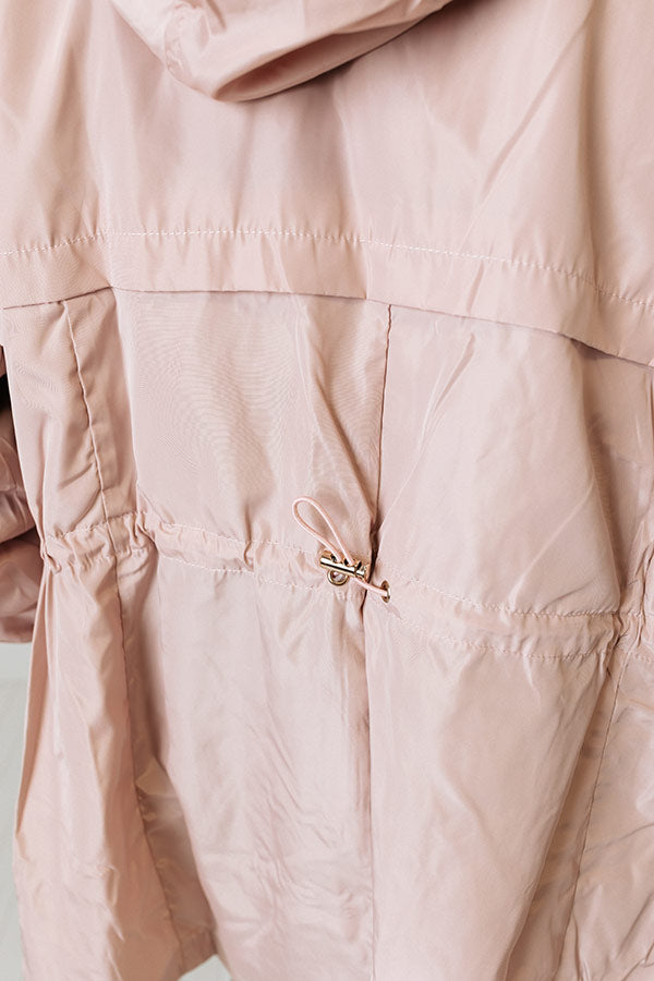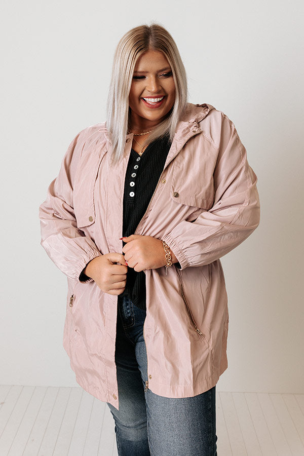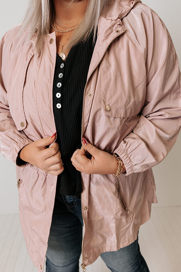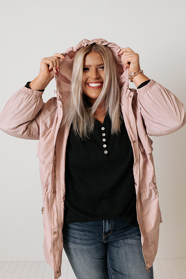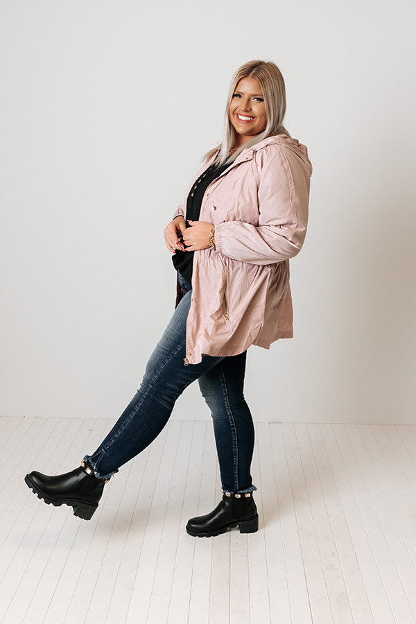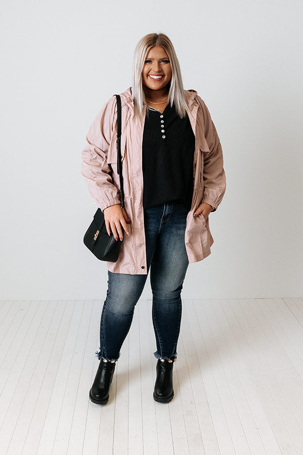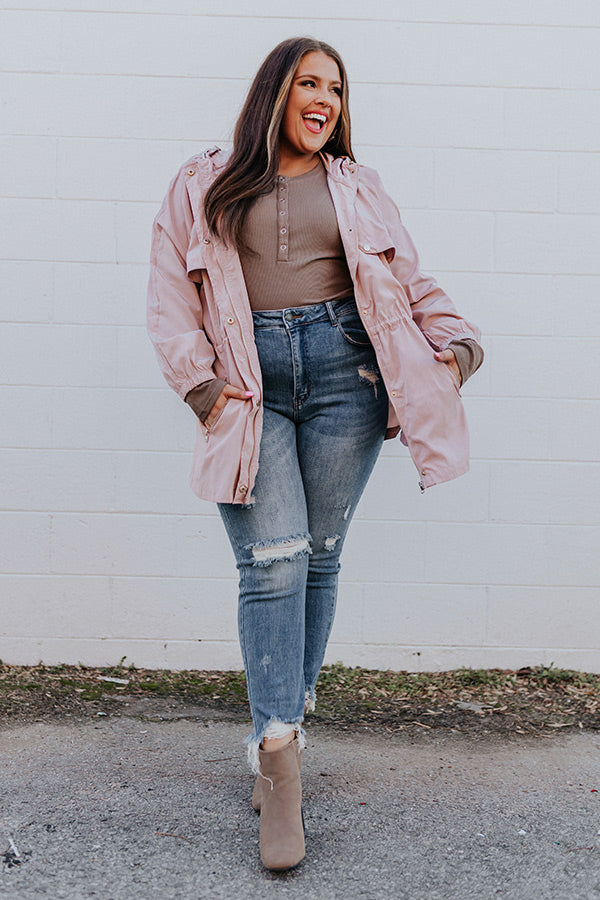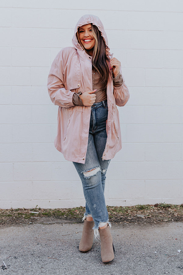 If fall time is on your mind, then this cute light blush parks is perfect for you with its lightweight material, long loose sleeves, a zip closure front with a hooded back, side pockets, a cinched waistline, and a relaxed silhouette that ends in a straight hemline!