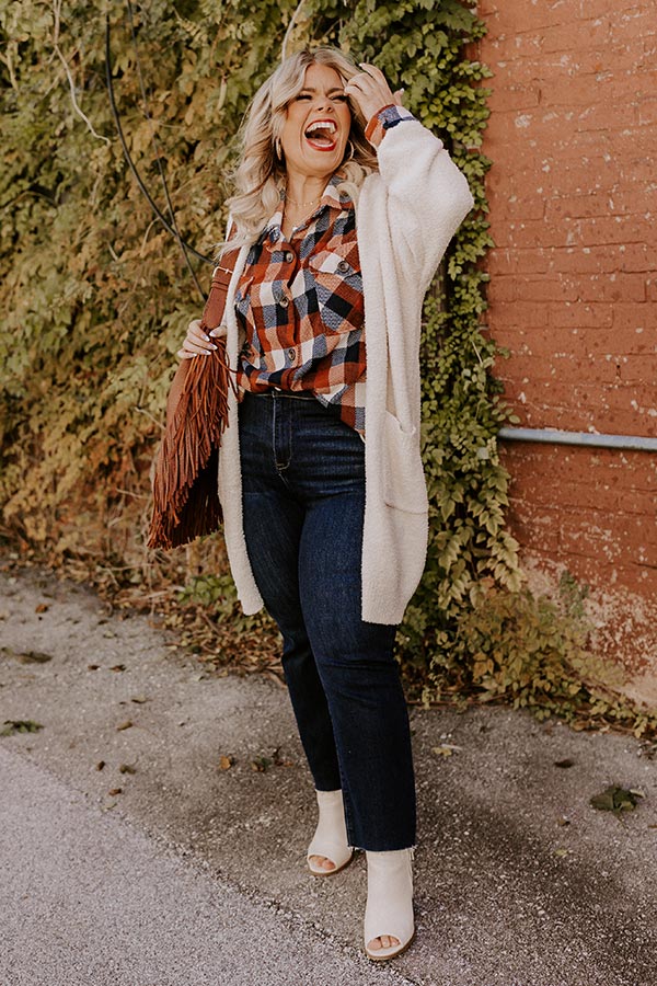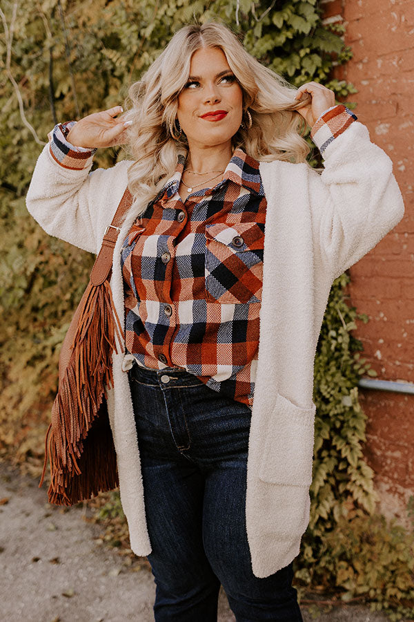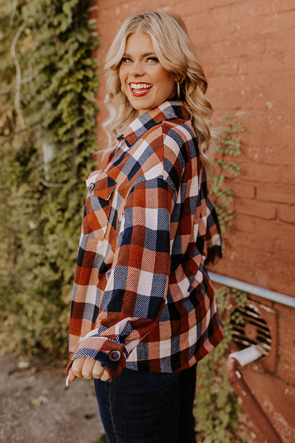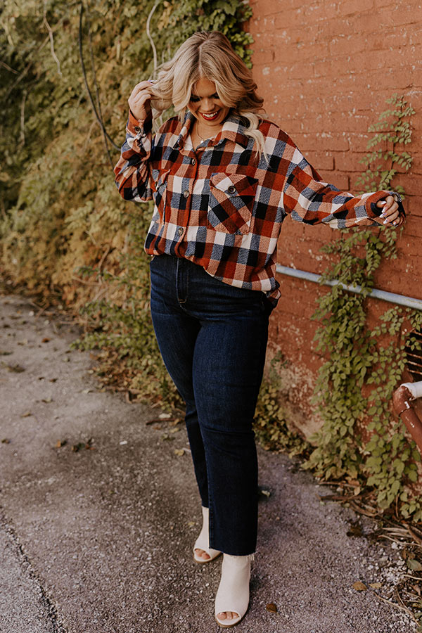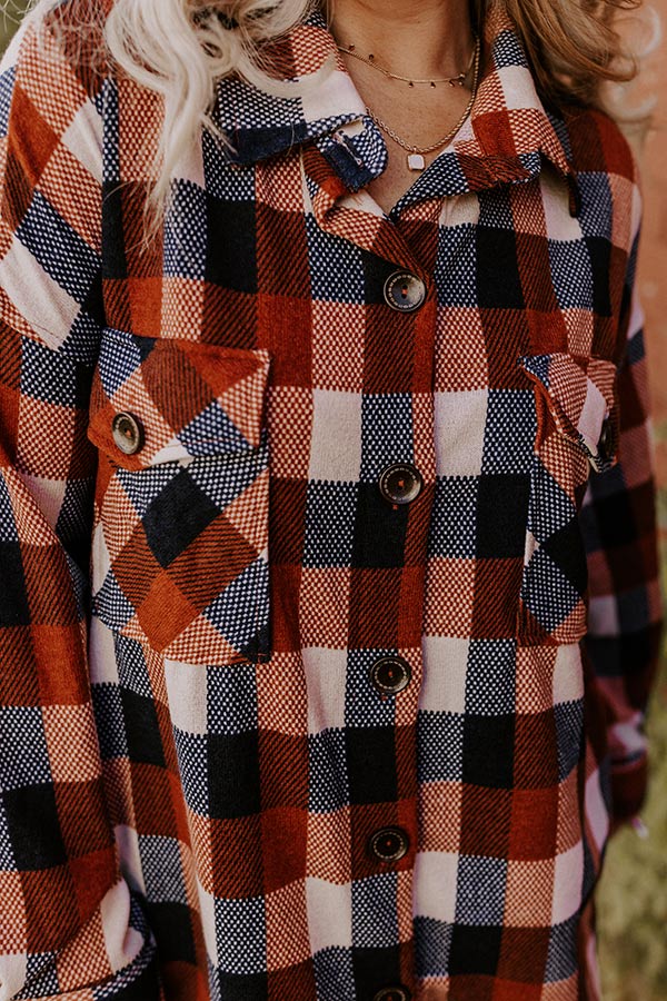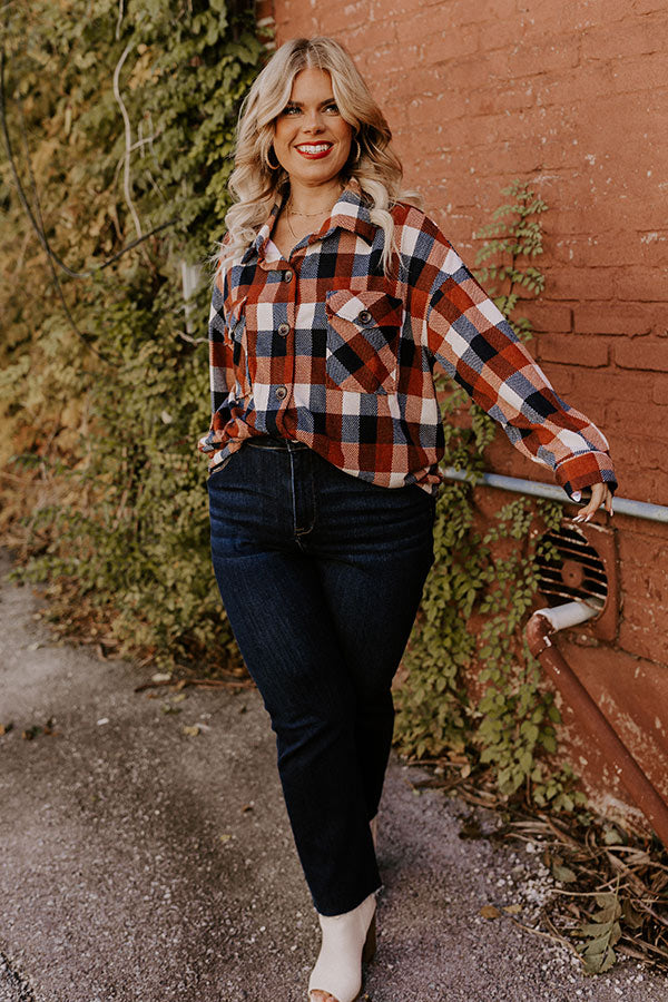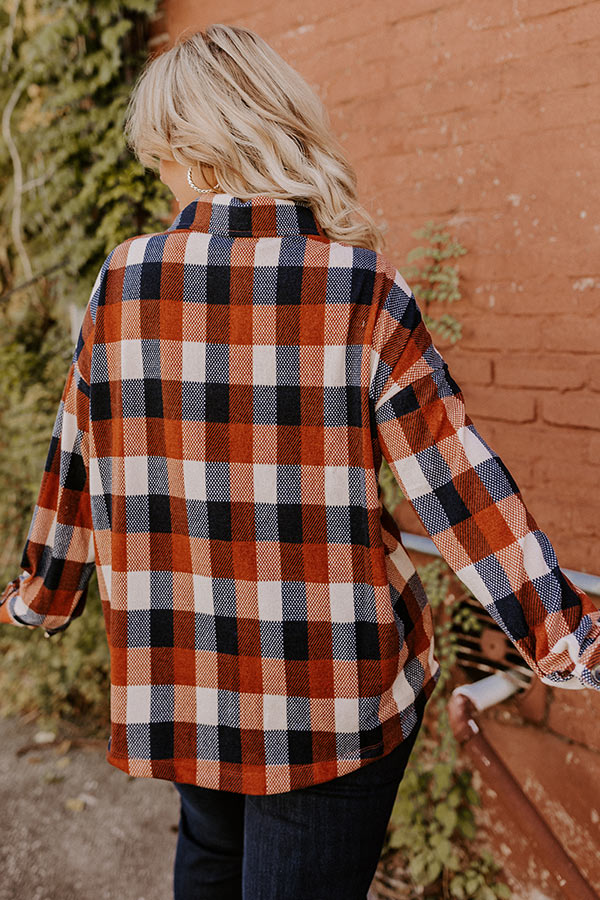 Feel the cool breeze in our 'Fallen Leaves' top! Features a soft stretchy material patterned with a blue and orange hued plaid design, a buttoned up front collared neckline, long loose sleeves with button closure cuffs, two chest flap pockets and a relaxed silhouette that falls into a round hemline.