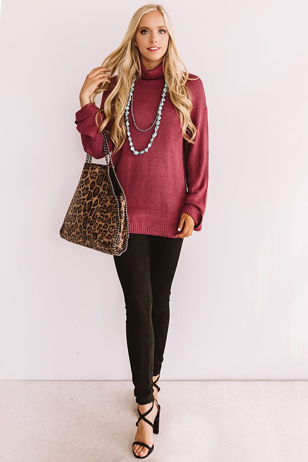 If you are already "fallin' for autumn" weather then this wine colored sweater is perfect for you with its stretchy tight knit textured material, high rounded turtle neckline, long loose sleeves with rolled cuffs, and ultra relaxed silhouette that falls into a straight tunic length ribbed hemline! We have styled this closet essential with some faux suede leggings, a turquoise statement necklace, strappy black heels, and a cheetah tote, but you can also wear it with some charcoal or denim flares, "The Seraphina Faux Leather Wedge in Grey," and our "All Caught Up Headband in Grey!"