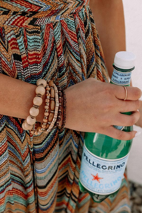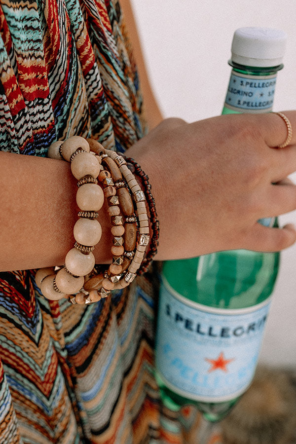No one's arm candy stack will be able to compare to yours when you accessorize with our boho 'Falling For Bali Bracelet Set' featuring seven wood and brown beaded stretch pieces!