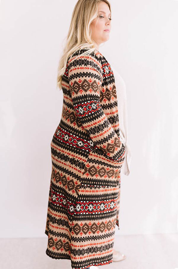 Plus Size - If you are already "falling for fall" weather then this unique cardigan is perfect for you with its lightweight tight knit material, abstract and colorful striped patterns, long semi loose sleeves, hidden side pockets, and relaxed open front silhouette that falls into a straight mid-calf length hemline! You can style this versatile piece with just about anything from a basic tank to a sweater, jeans to dresses, wedges to sandals, clutches to totes, and hats to earrings! Measurements