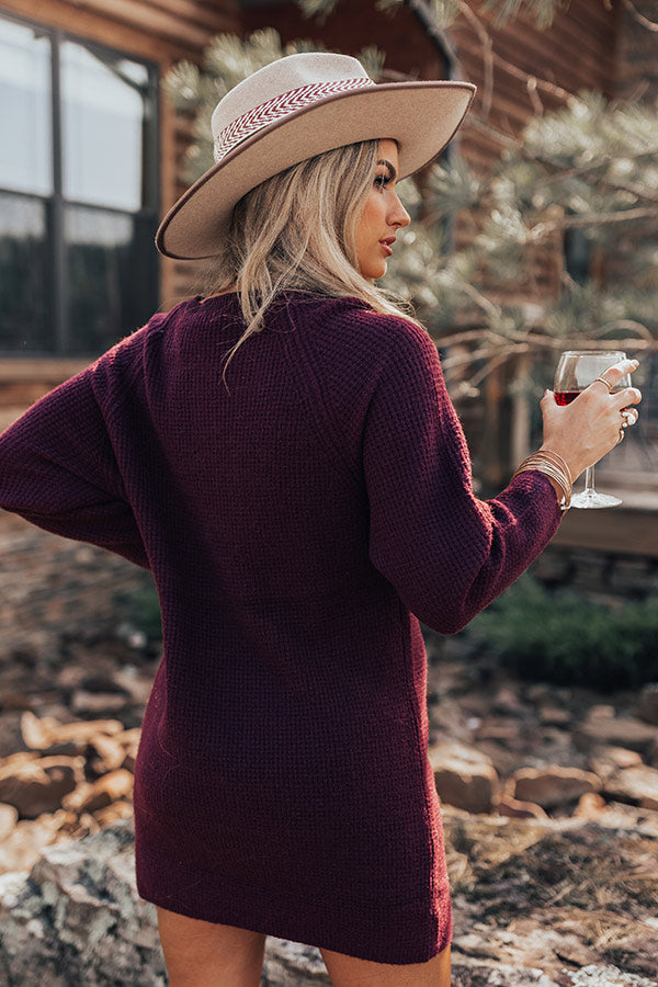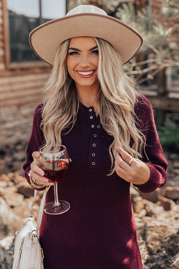 We have no doubt you will fall in love with this adorable windsor wine colored sweater dress featuring soft knit material with waffle knit texturing, a button up bodice with a rounded neckline, long loose sleeves, and a flattering silhouette that ends in a straight mid-thigh length hemline! Measurements