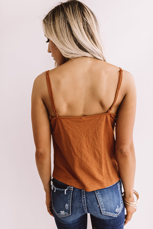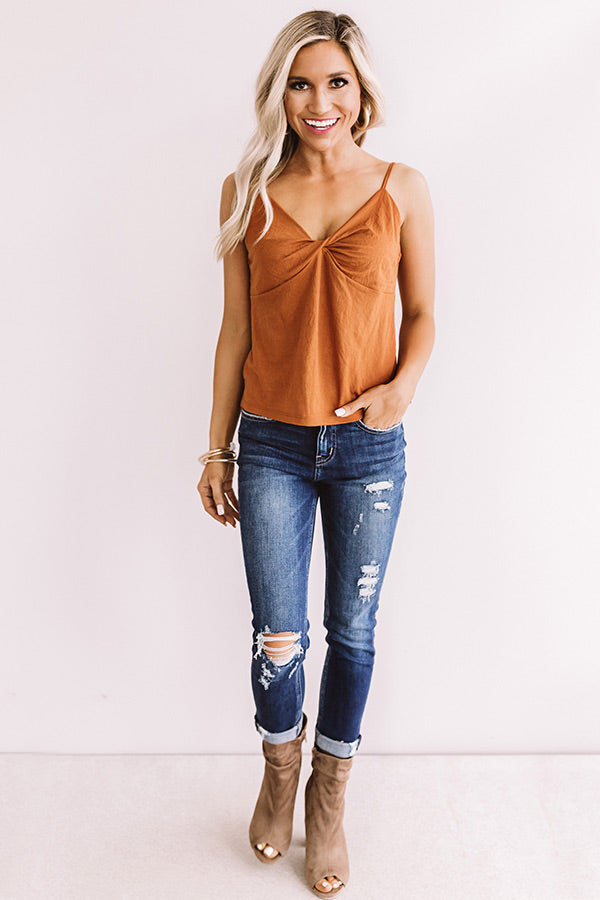 Everyone will be falling for the trend you set with this cinnamon tank featuring adjustable spaghetti straps, a wrapped bodice with a v-cut neckline, a low open back, and a relaxed bodice that falls into a straight hemline! This year round piece can be styled a variety of ways, like under a cardigan with some distressed skinnies and a neutral peep toe bootie and tote for the chillier fall days, and with some distressed white shorts, "The Darrian Wedge in Maple," and our "Suncatcher Hat" for the warmer summer weather! Measurements