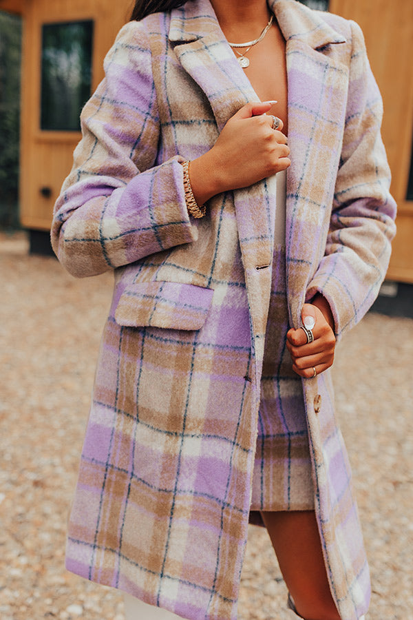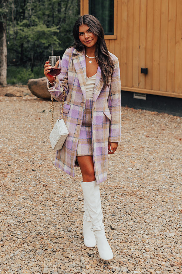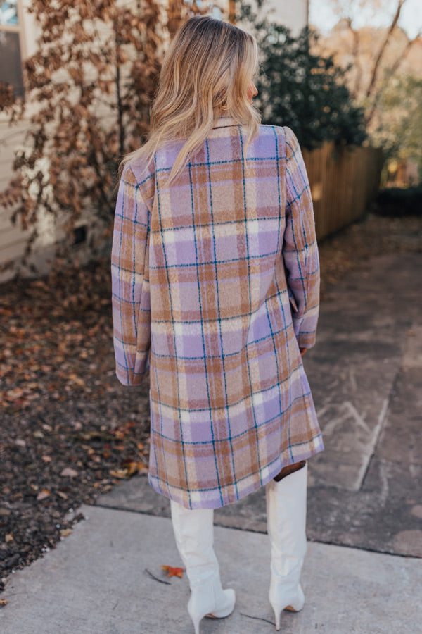 - Fully lined warm material with a purple, brown, and blue hued plaid print