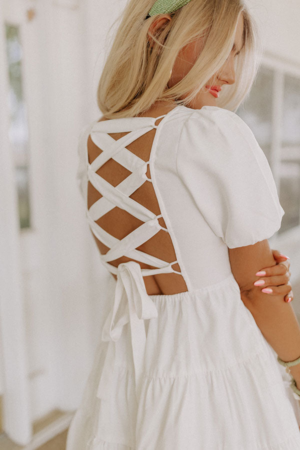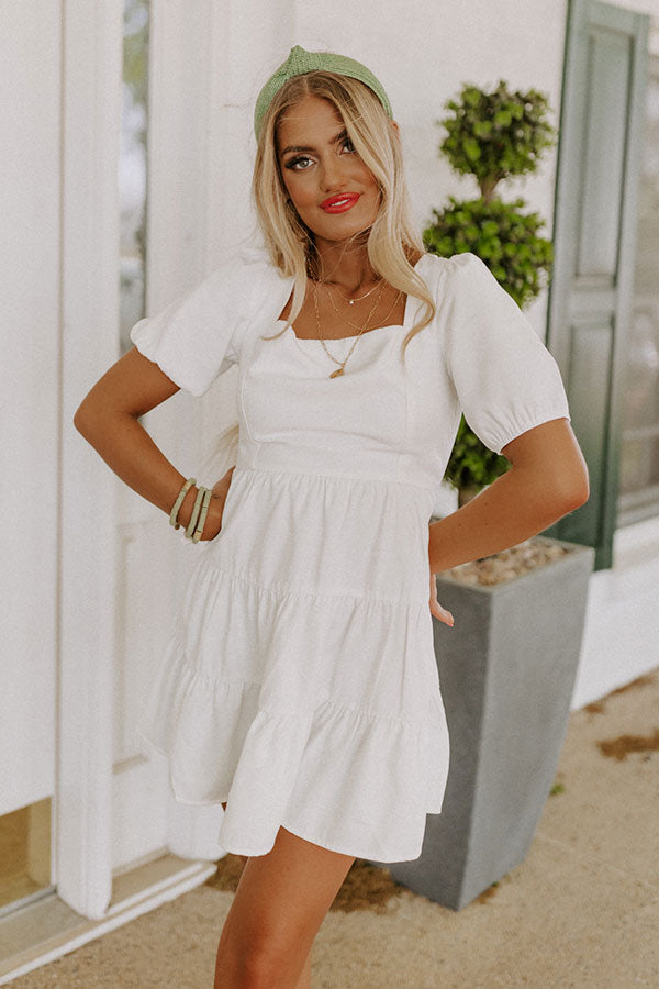 We have no doubt you will fall head over heels in love with this adorable white dress featuring lightweight material, a square neckline, short puff sleeves, a flirty lace-up back, hidden side pockets, and a relaxed tiered babydoll skirt silhouette that falls into a straight mid-thigh length hemline!