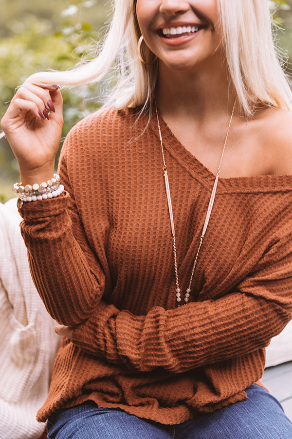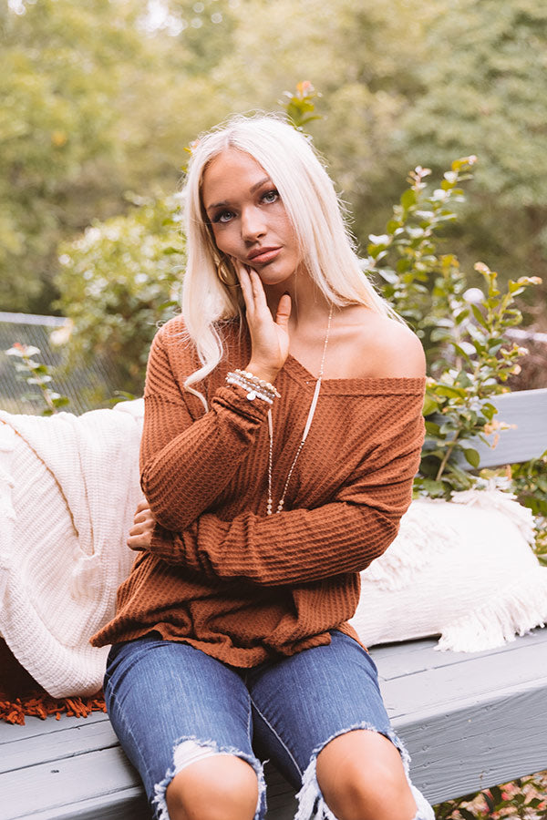 Get festive in our darling brown "Falls Frills" top featuring soft lightweight material with waffle knit texturing, a wide v-cut neckline that can be worn to one side, long loose sleeves, and a relaxed silhouette that falls into a rounded hemline with accent side notches! Measurements