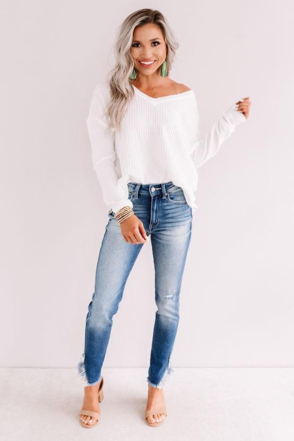 Get festive in our darling white "Falls Frills" top featuring soft lightweight material with waffle knit texturing, a wide v-cut neckline that can be worn to one side, long loose sleeves, and a relaxed silhouette that falls into a rounded hemline with accent side notches! Measurements