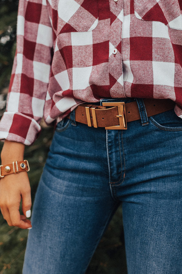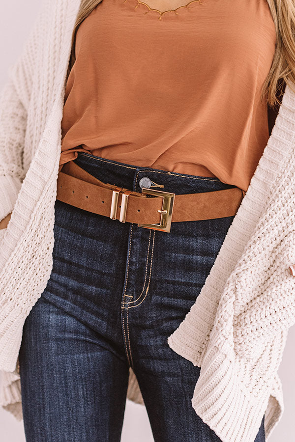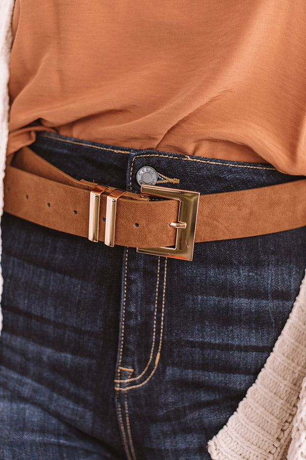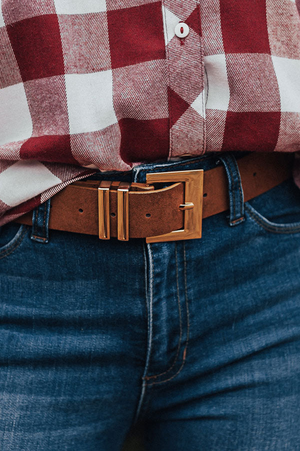 You won't find a better finishing touch for your OOTD than our brown "Fame Game" statement belt featuring a wide faux suede band with a gold square buckle hardware!