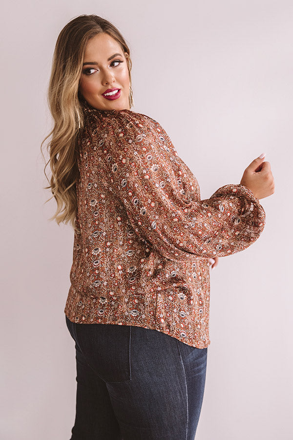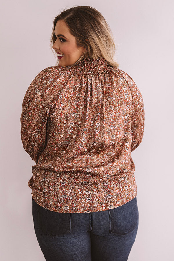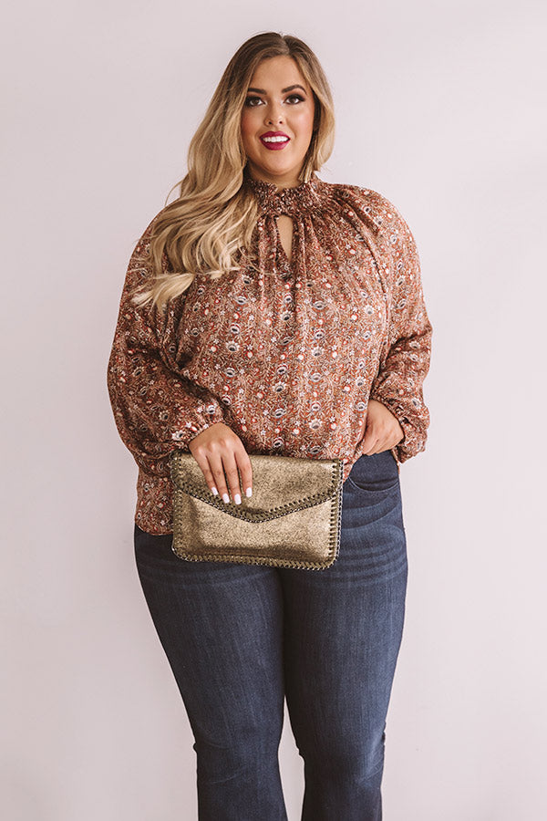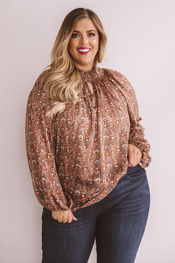 Plus Size - Our cinnamon colored "Fancy Flourish Shift Top" has us dreaming of warmer weather with its breezy lightweight semi-sheer material, an intricate floral print pattern with subtle metallic detailing, a smocked turtle neckline with a button closure v-cutout accent, long loose bishop sleeve with fitted elastic banded cuffs, and a relaxed silhouette that falls into a straight hemline! We have styled this adorable transitional piece with some dark wash denim flares, a matching gold clutch, and neutral booties, but you can also wear it with some distressed light wash ankle skinnies, "The Jess Faux Leather Heel in Natural," and our "All Caught Up Headband in Ivory!" Measurements
