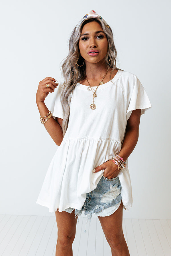 Stay simple but stylish in our cute white 'Farmers Market Meetup Shift Top' featuring lightweight material, a rounded neckline, short loose sleeves, and a relaxed peplum silhouette that falls into a straight hemline! on products