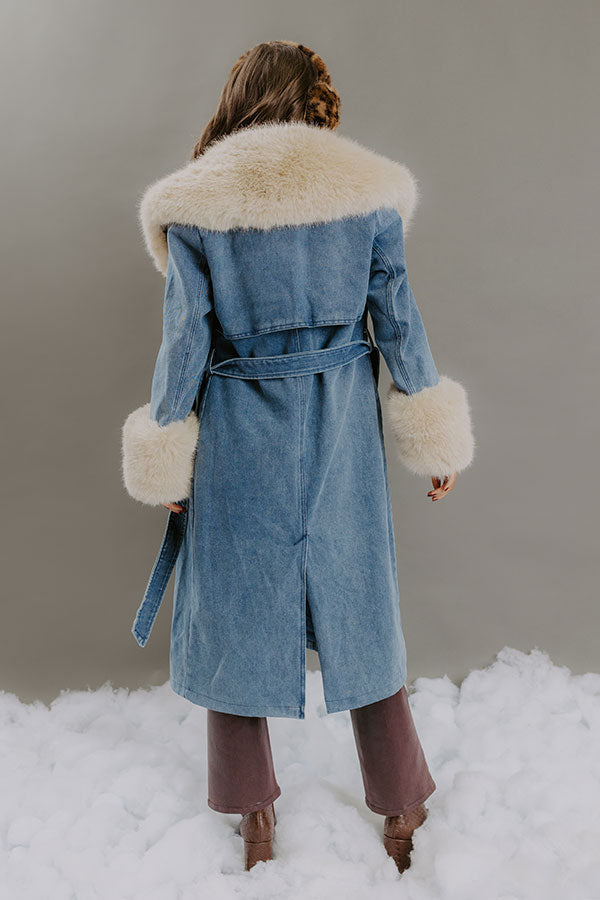 - Chic and playful, this denim coat adds instant style to any outfit! Its removable faux fur detail makes it a versatile piece perfect for cozy, on-trend looks. - Lined denim material - A detachable faux fur detail that buttons onto the collar - A v-cut neckline - A buttoned front - Functional side pockets - A relaxed silhouette that ends in a straight hemline