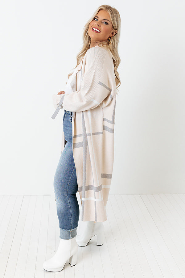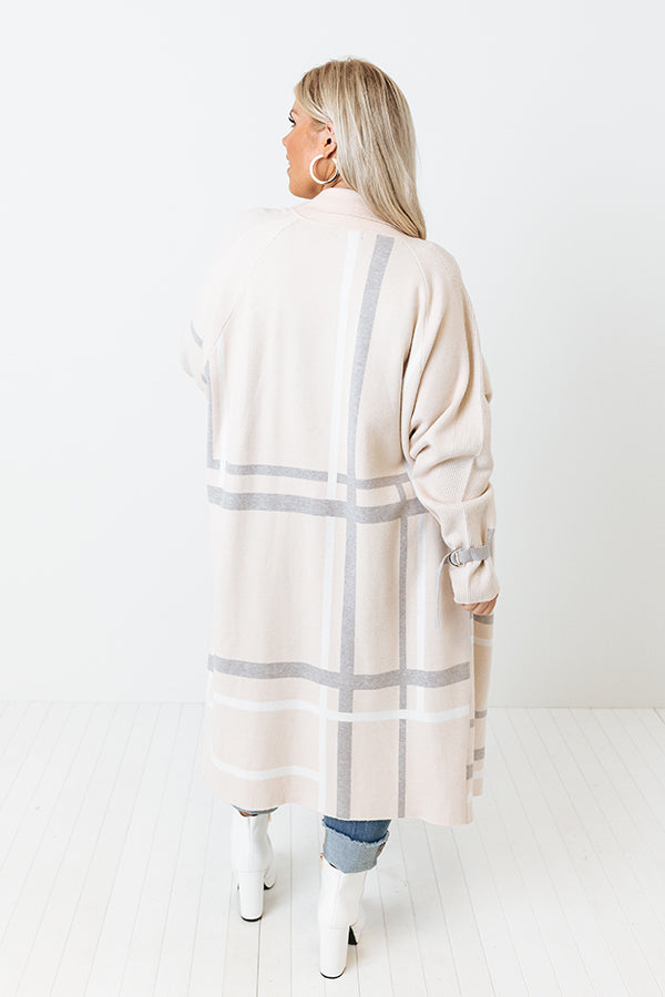 Layer up beautifully in our adorable light birch hued plus size 'Fashion Haul Cardigan' featuring soft knit material patterned with an oversized grey and white plaid print, long loose sleeves with buckle closure cuffs, a collared neckline, and a draped open front silhouette that cascades into a straight mid-calf length hemline!