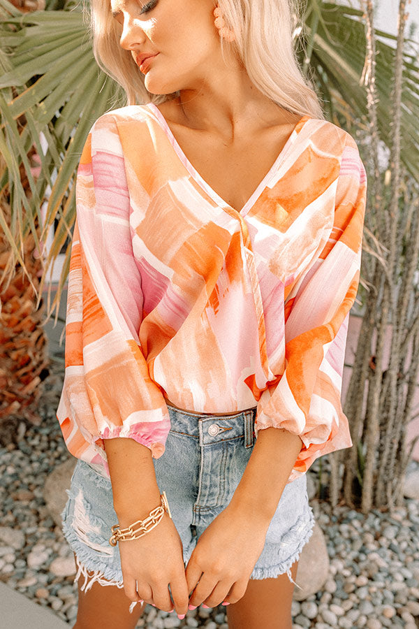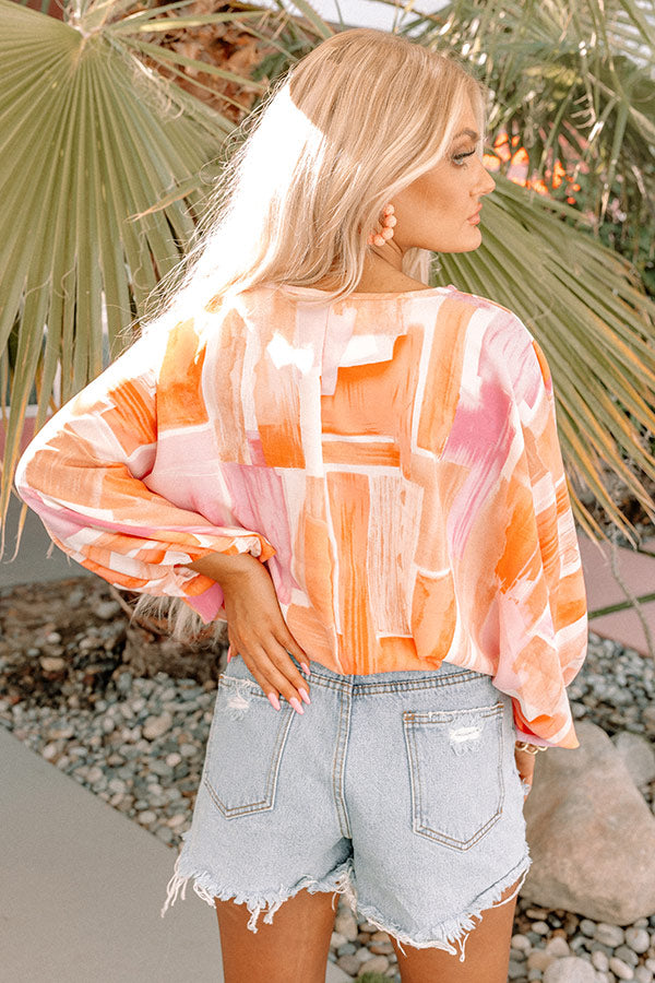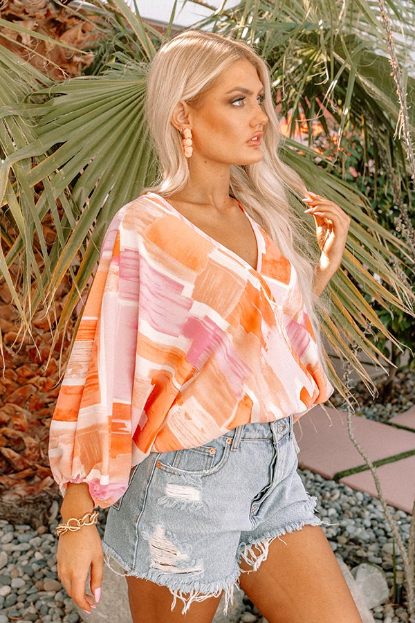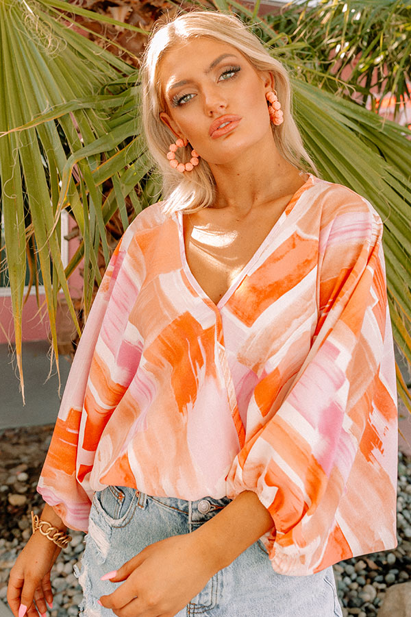Don't hesitate to add our chic 'Fashion Haul Top' to your cart with its lightweight material, unique pink and coral hued print, faux wrap bodice with a v-cut neckline, long oversized batwing sleeves, and a slouched silhouette that falls into an elastic waistline!