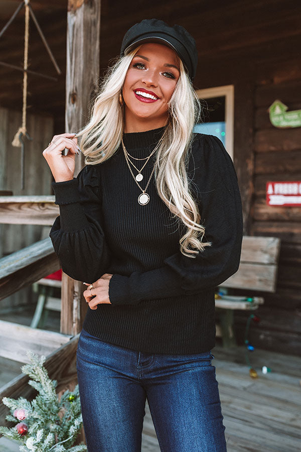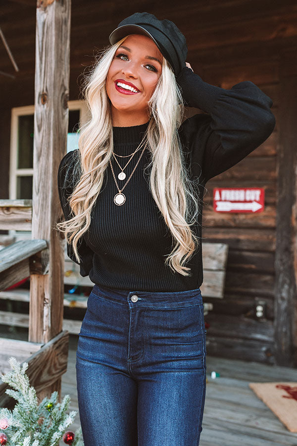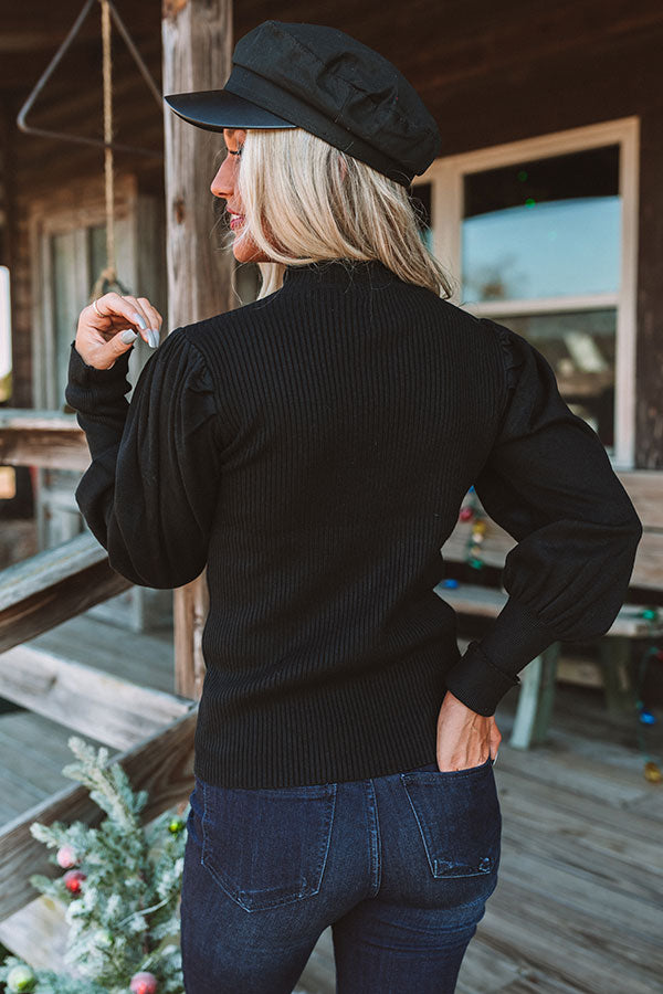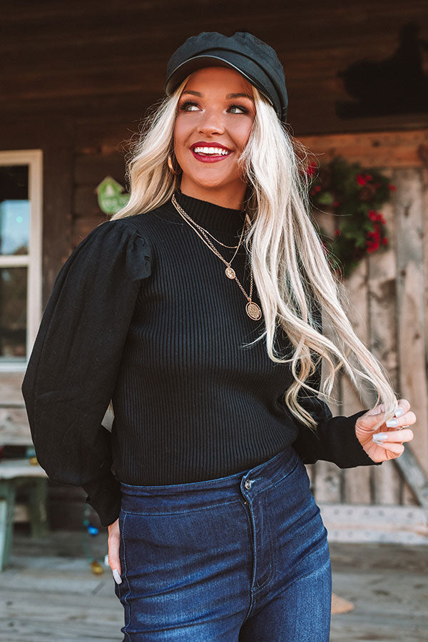 Make a grand entrance onto the fashion scene with this stunning black sweater top featuring soft lightweight tight knit material with vertical ribbed texturing down the bodice, a turtle neckline, long bishop sleeves with fitted forearm cuffs, and a flattering silhouette that ends in a straight hemline! Measurements