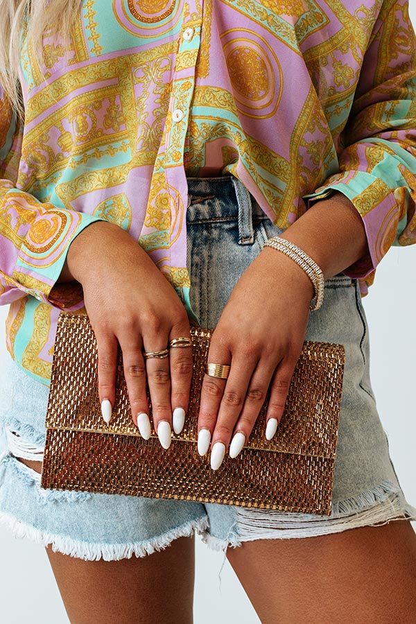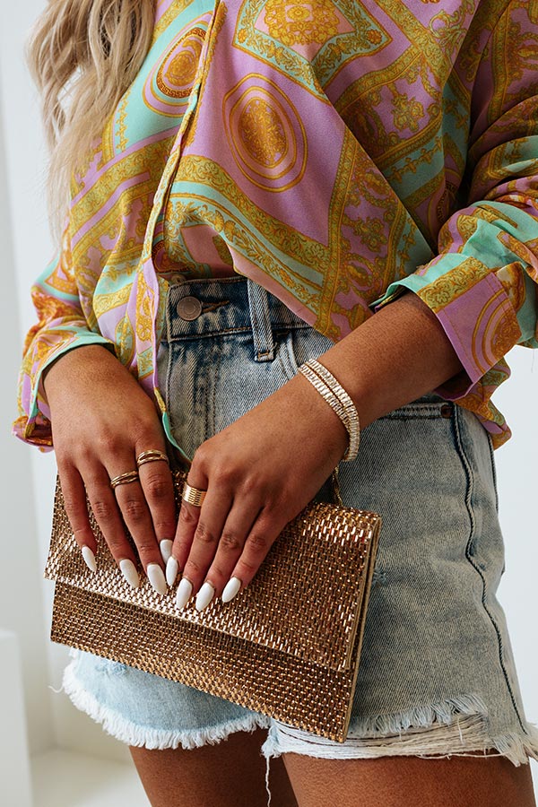 Glamorize your look with our stunning 'Fashion Talks Clutch' featuring shimmering gold rhinestones, a magnetic flap closure, a chain link shoulder strap, and a spacious fully lined interior!