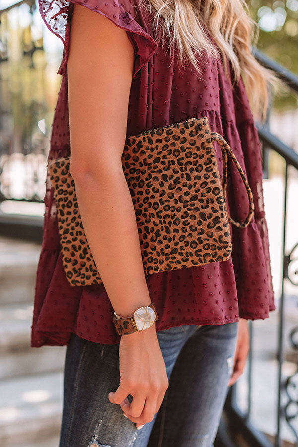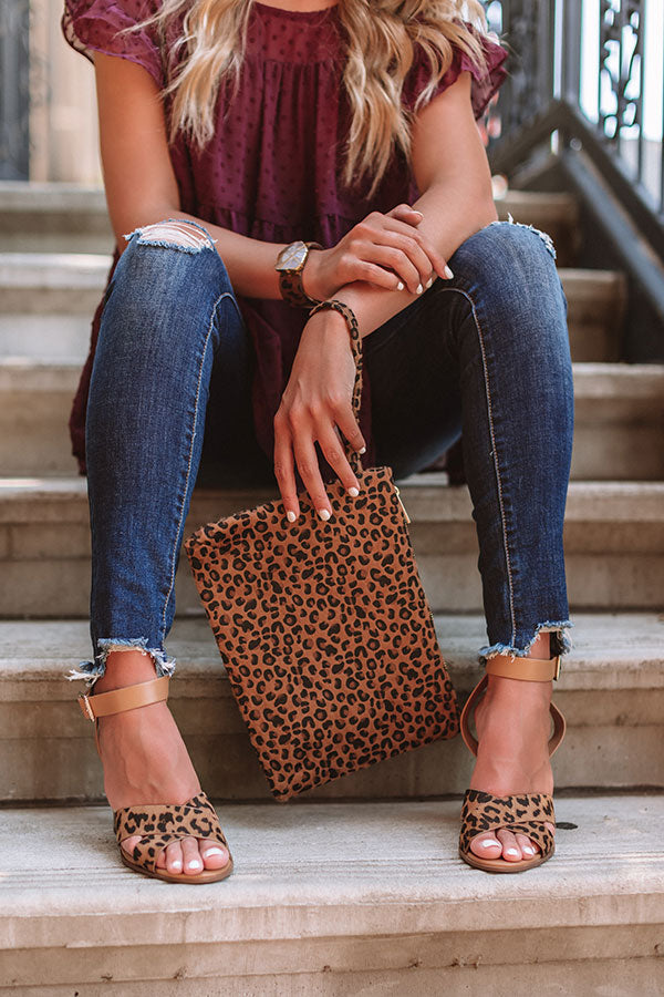 This clutch is for sure be the best "fashion week find" with its leopard pattern, wrist strap, and zippered rectangle pouch!