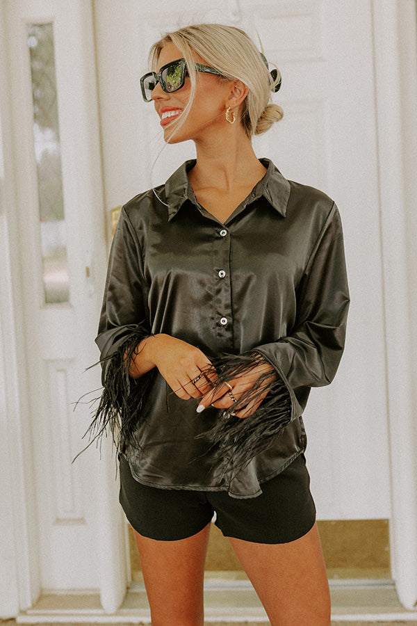 You are sure to be the most fashionable on the scene when you arrive in this chic black top featuring lightweight satin material, a button down front with a collared neckline, long loose sleeves with feather cuffs, and a relaxed silhouette that falls into a rounded hemline!