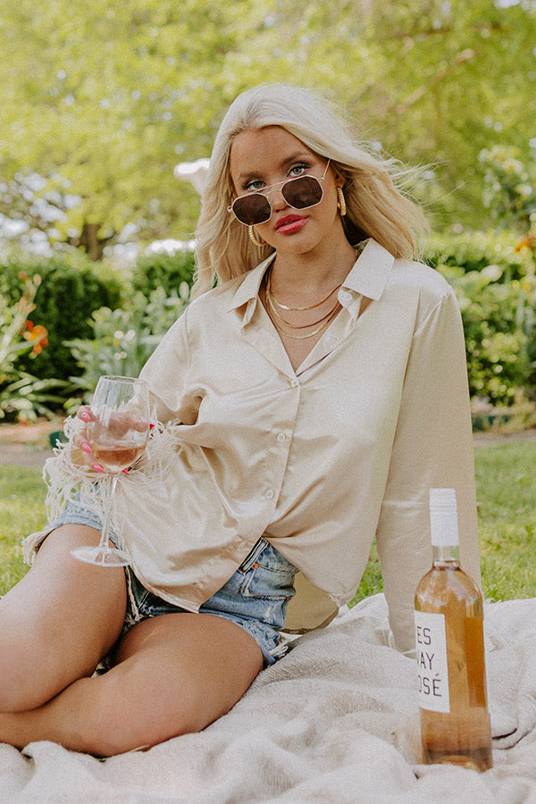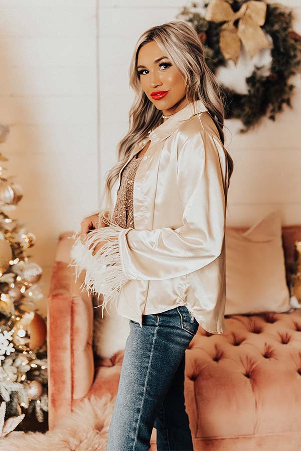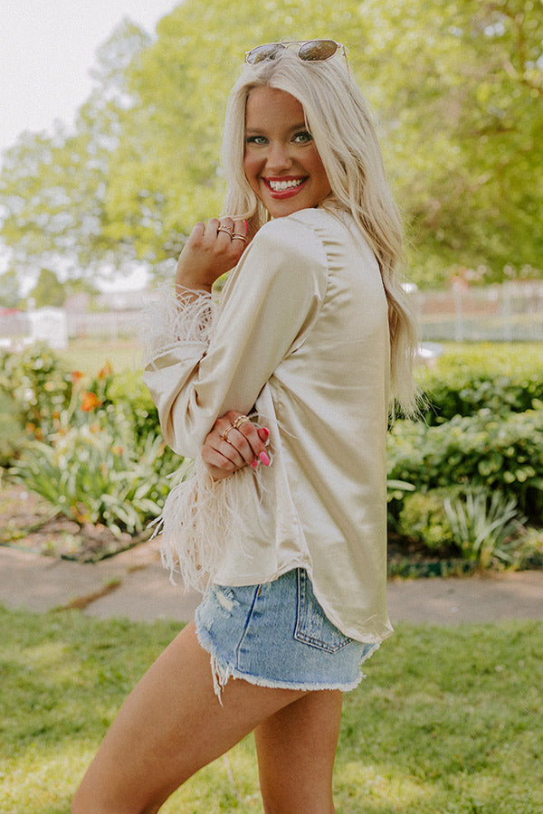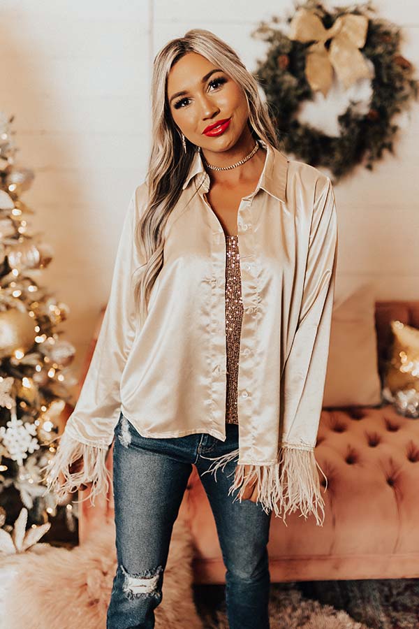 You are sure to be the most fashionable on the scene when you arrive in this chic champagne colored top featuring lightweight satin material, a button down front with a collared neckline, long loose sleeves with feather cuffs, and a relaxed silhouette that falls into a rounded hemline!