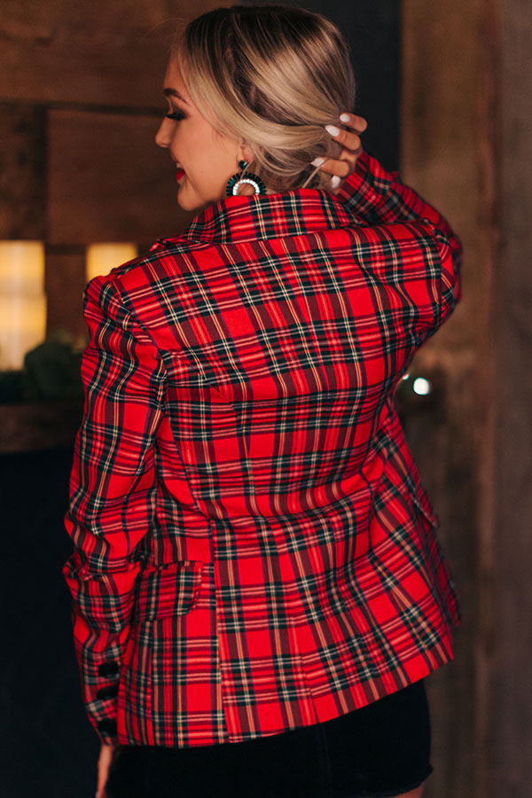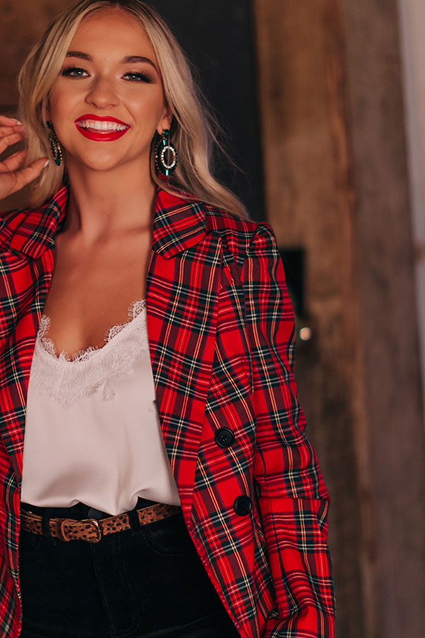 You are sure to look "fashionably festive" when you wear this stunning blazer featuring lightweight stretchy material patterned with black, red, and green plaid, a collared flap neckline with v-cut notches, hidden side pockets, long semi-loose sleeves with button closure cuffs, and a relaxed silhouette that falls into a straight hemline! We have styled this piece over a basic white tank with a black corduroy skirt, red booties, and a leopard statement belt, but you can also swap the skirt for some distressed ankle skinnies, the red booties for "The Alice Faux Suede Knee High Boot in Black," and the belt for a black faux suede hat and tote! Measurements