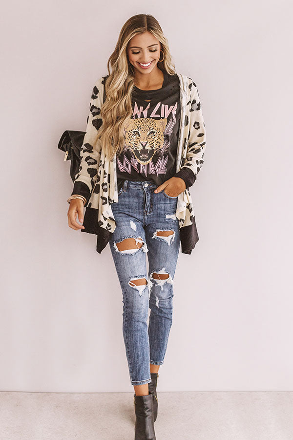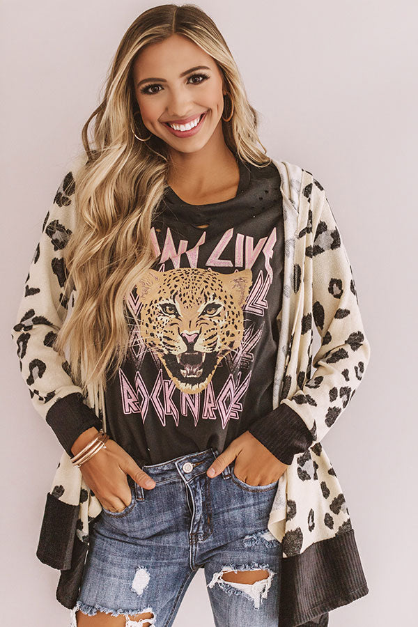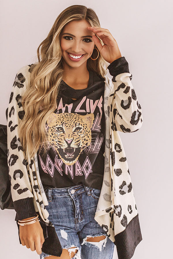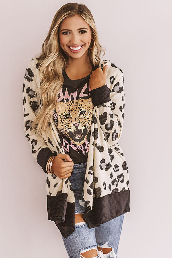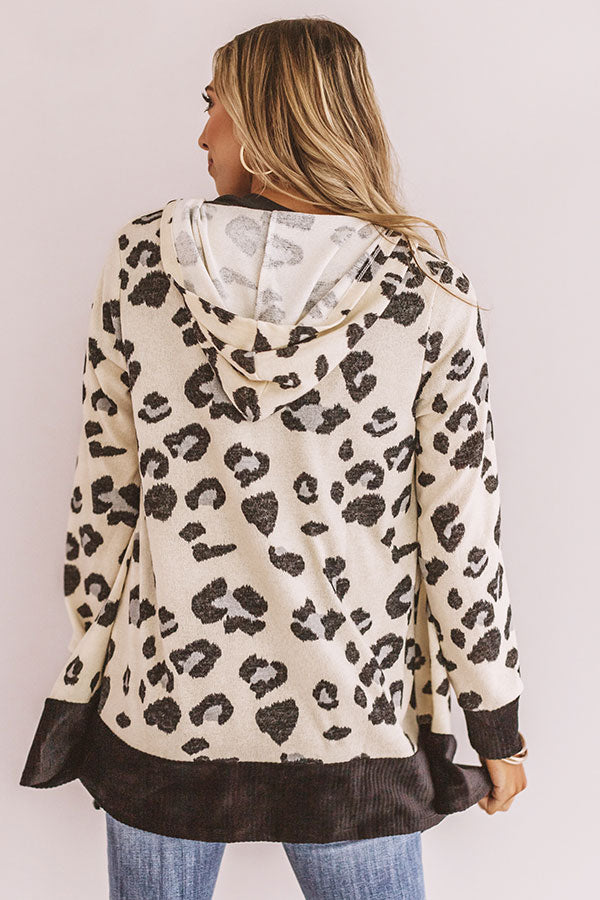 There is no better way to show up "fashionable late" than in this fierce ivory colored cardigan featuring soft lightweight tight knit material patterned with a bold black leopard pattern, subtle ribbed texturing, long loose sleeves with fitted cuffs, a hooded back, and a draped open front silhouette that falls into a straight upper thigh length hemline! You can style this versatile piece with just about anything from a basic tank to a sweater, jeans to skirts or dresses, booties to wedges or sandals, clutches to totes, and hats to earrings! Measurements