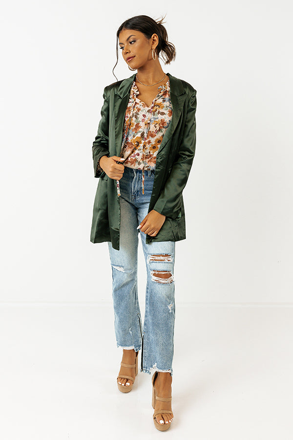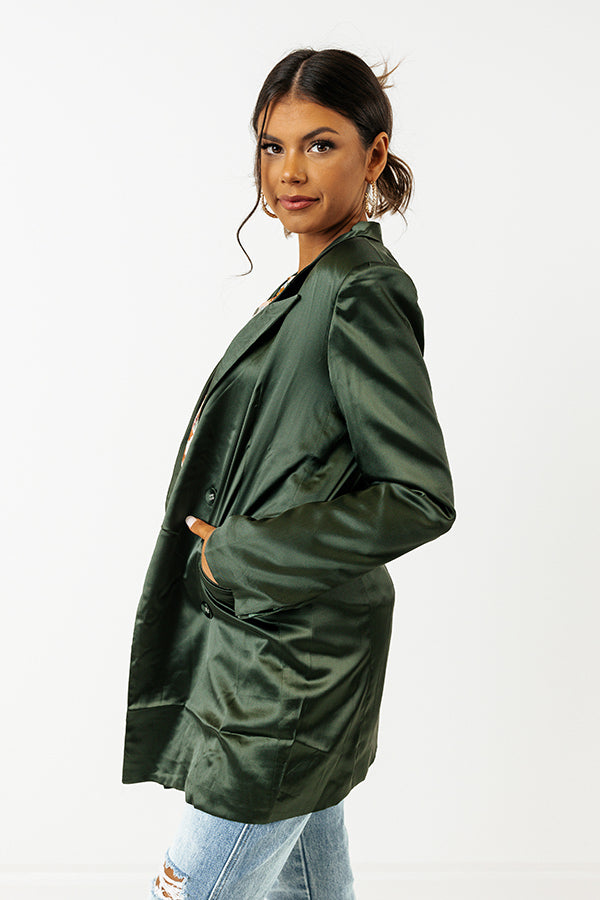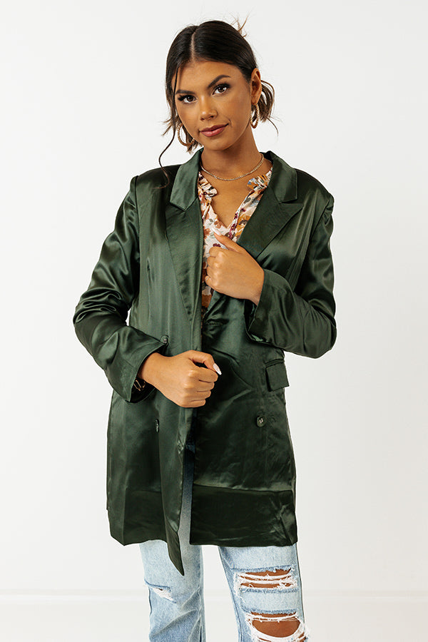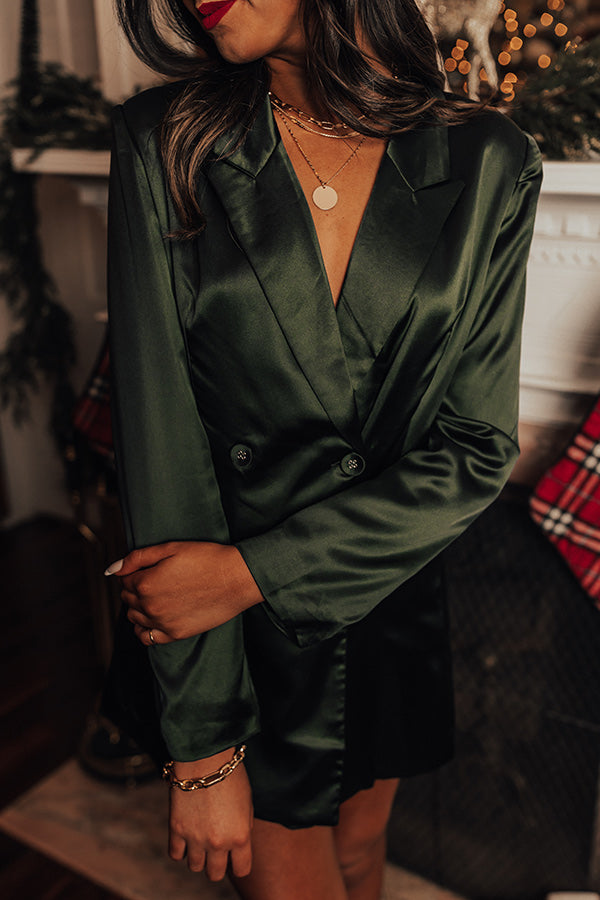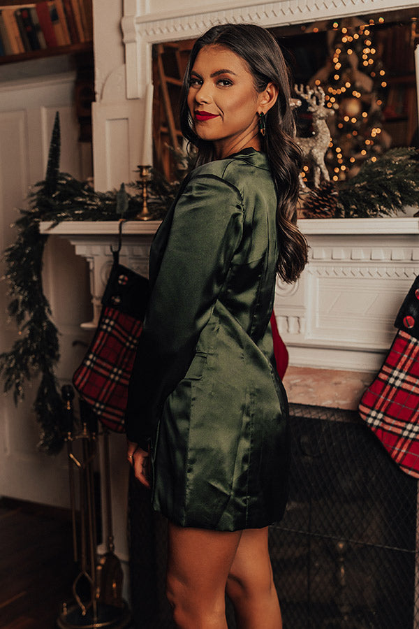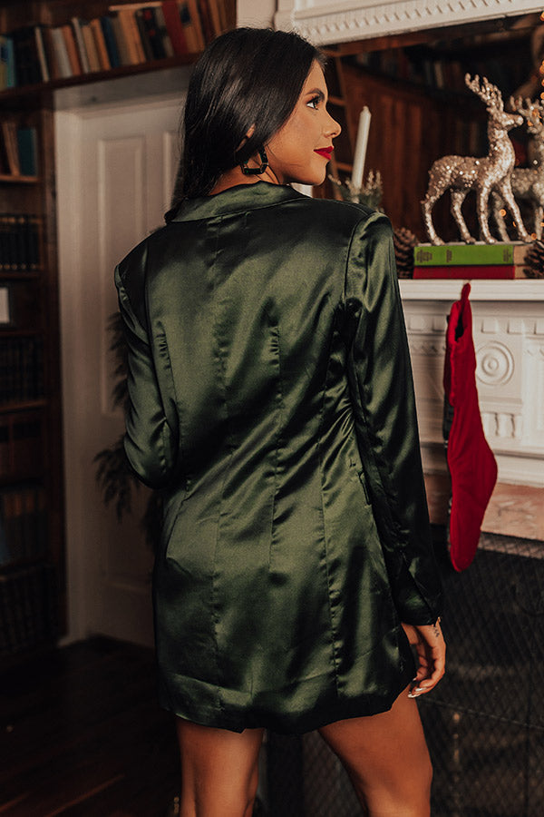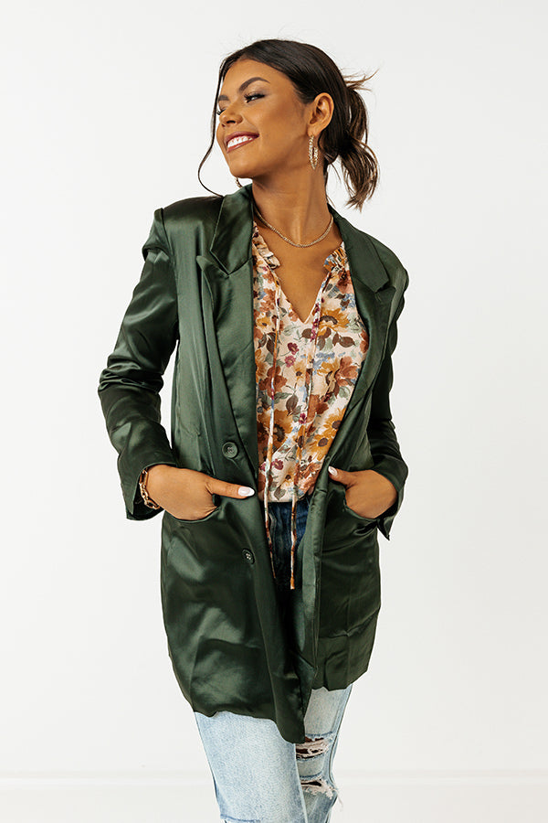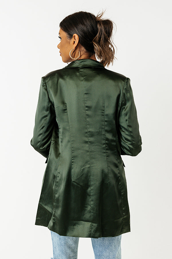 Life is a runway in our 'Fashion's Latest' blazer dress! Features sleek forest colored lightweight satin material, a four button closure front, a collared neckline, long loose sleeves, functional low pockets with flap closure, and a flattering silhouette that ends in a straight hemline.