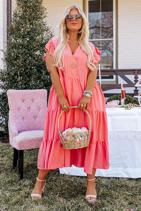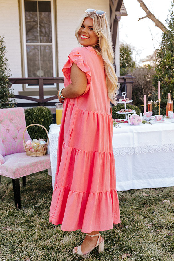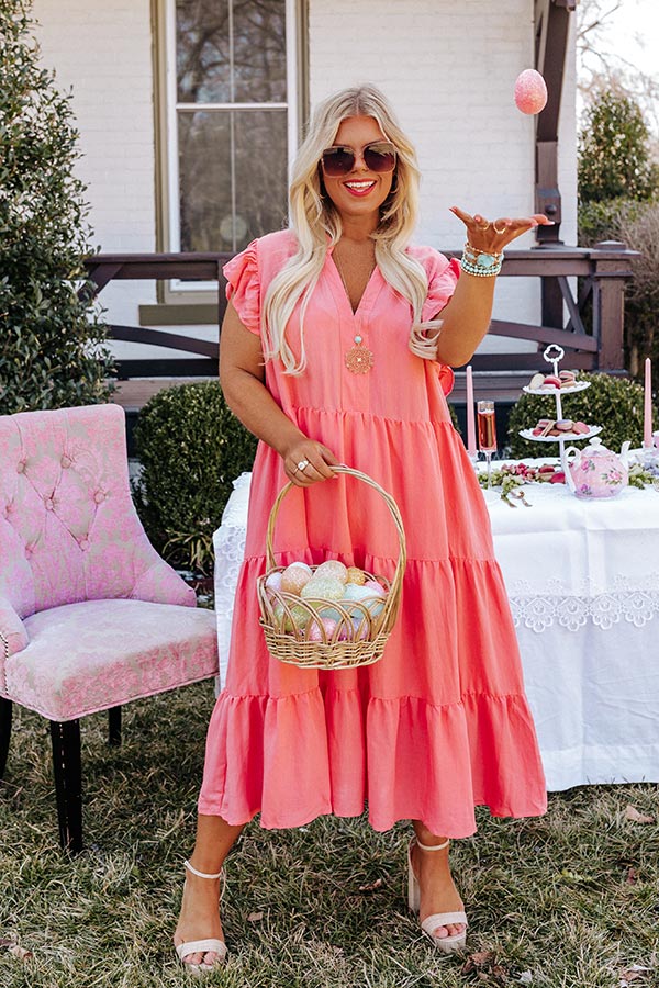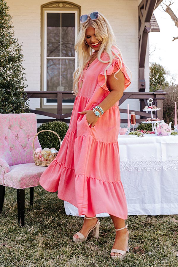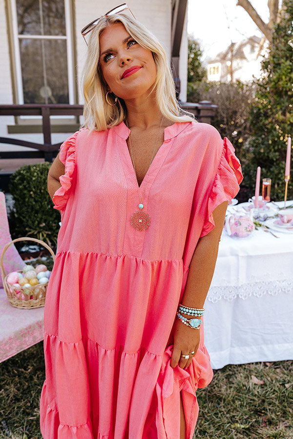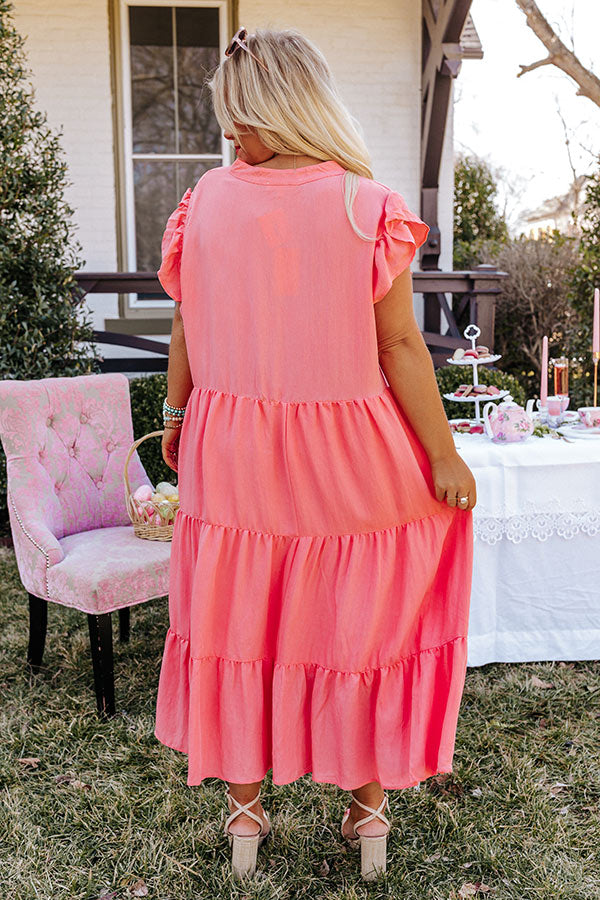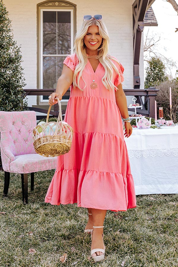 Plus Size - You plus this blooming dahlia colored midi dress equals fate! You are sure to love this cutie with its lightweight flowy material, flirty v-cut neckline, ruffled cap sleeves, hidden side pockets, and relaxed tiered silhouette that cascades into a mid-calf length peplum hemline!