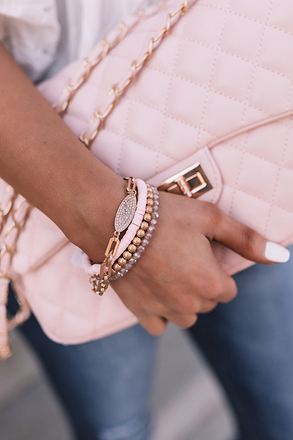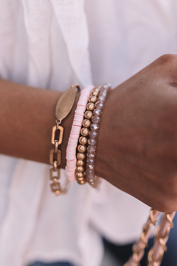 We have no doubt this bracelet set will be your favorite of all with its three stretchy pink, clear, and gold beaded pieces and chain link piece with an accent stone!