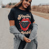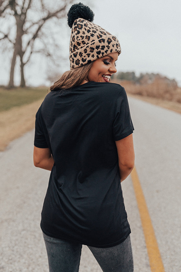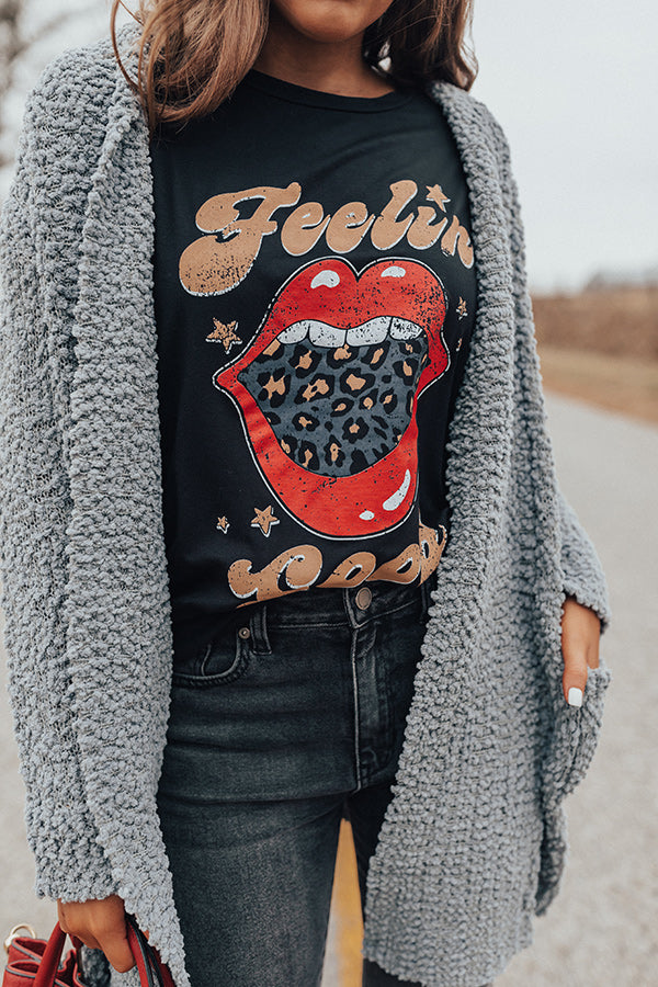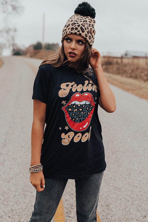 You will undoubtedly be "feelin' good" when you wear this black boyfriend tee featuring soft lightweight material, a high rounded neckline, short sleeves, an adorable front graphic, and a relaxed silhouette that falls into a straight hemline! This chic grunge piece can be styled up under a knit cardigan with some frayed ankle skinnies, white booties, a leopard beanie, and a red tote, or you can dress it down by wearing it under a distressed denim jacket with our "Under The Stars Camo Joggers," a chic backpack, and "The Delaney Sneaker in Gold!" Measurements