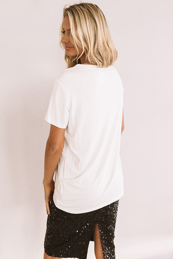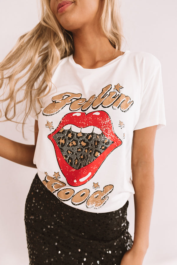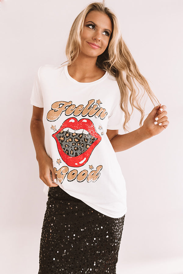 You will undoubtedly be "feelin' good" when you wear this ivory colored boyfriend tee featuring soft lightweight material, a high rounded neckline, short sleeves, an adorable front graphic, and a relaxed silhouette that falls into a straight hemline! Measurements