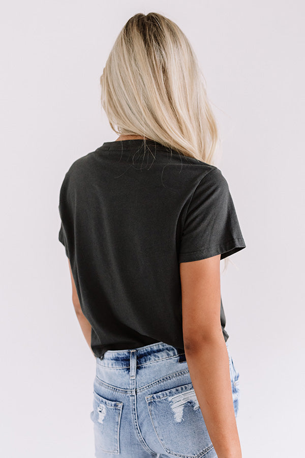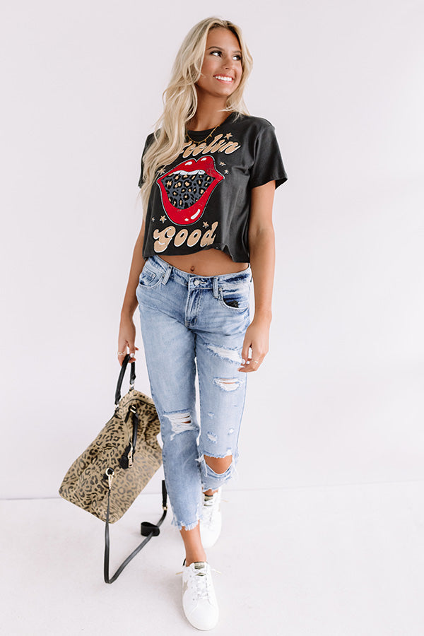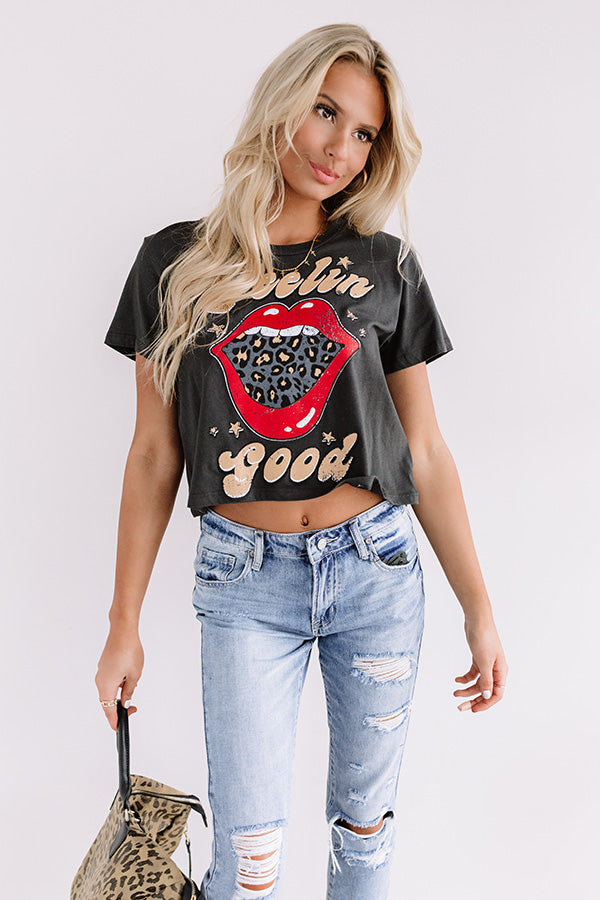 You will undoubtedly be "feelin' good" when you wear this black tee featuring soft lightweight material, a high rounded neckline, short loose sleeves, an adorable leopard and red lips front graphic, and a relaxed silhouette that falls into a straight cropped hemline! You can dress this adorable piece down with some distressed ankle skinnies, trendy sneakers, and a leopard tote, or you can wear it with our "Set To Snuggle Joggers in Charcoal," a red hair scarf, and "The Lyla Sandal in Red!" Measurements