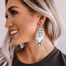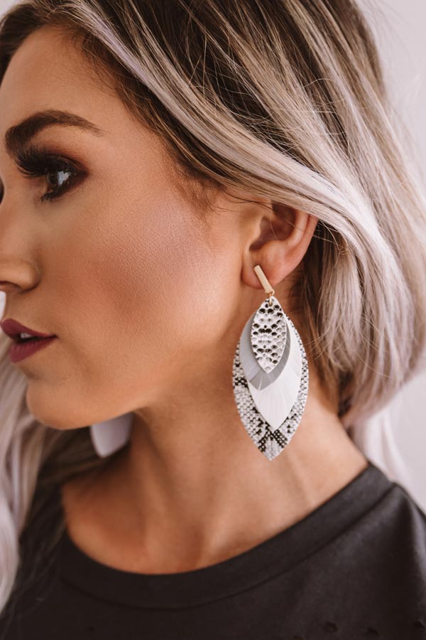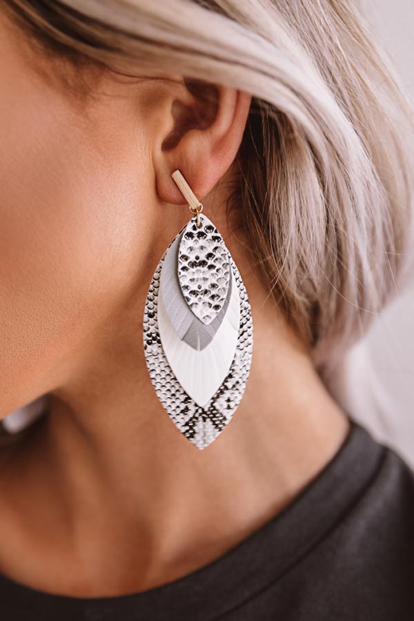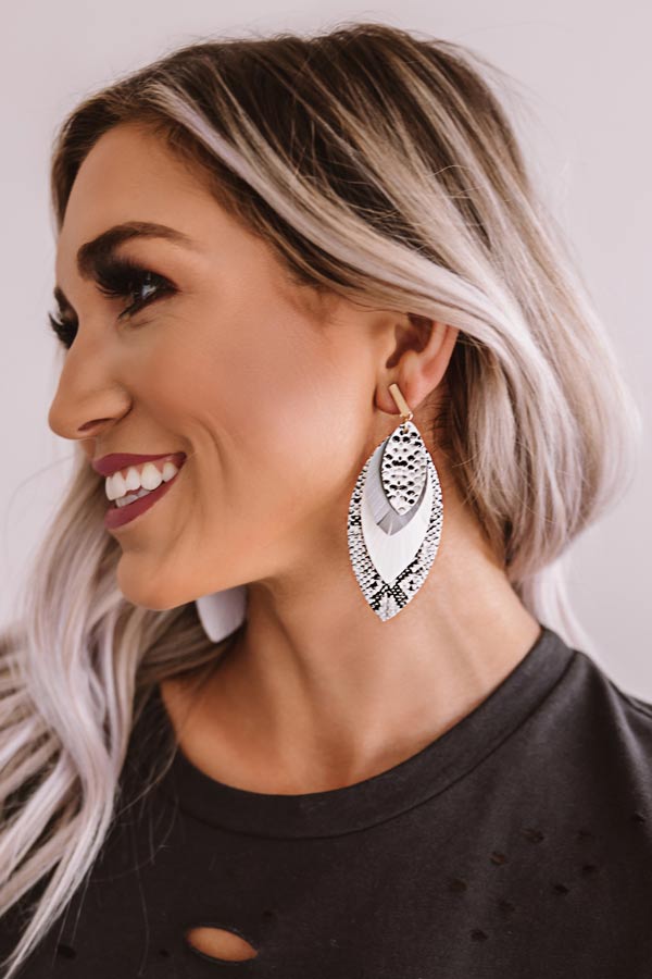 Take a walk on the wild side and accessorize with our "Feeling Affectionate" statement earrings featuring layered grey metallic and black and white snake print faux leather leaves with fringed edge detailing!