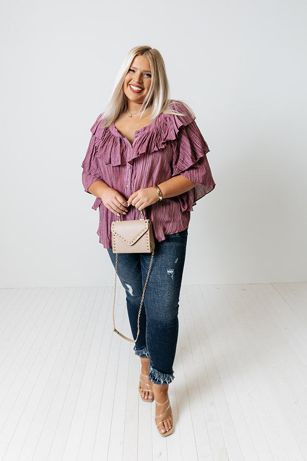 You are sure to feel ecstatic when you complete your look with this beautiful plus size dark magenta hued shift top featuring lightweight flowy material with shimmering accent stripes, a button down front with a scooped neckline, tiered ruffle half sleeves, and a relaxed silhouette that falls into an uneven hemline!