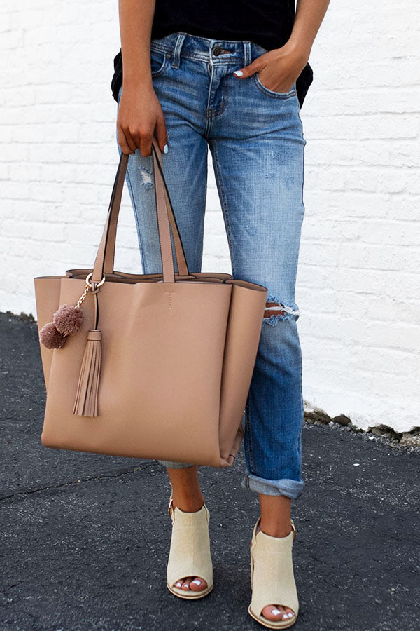 Faux leather tote bag with detachable pom pom & tassel accented keychain.
