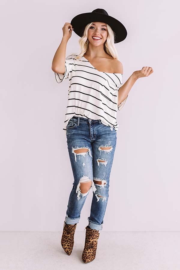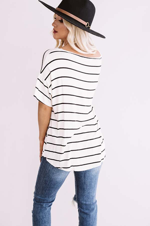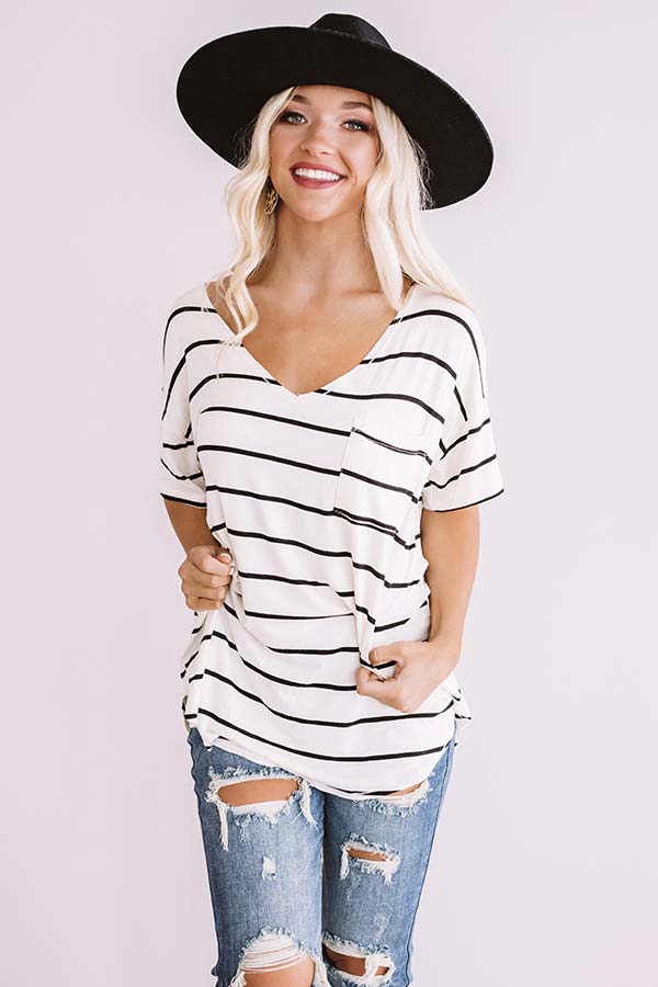 You'll be "feeling fortunate" the second you try on our favorite new striped tee! This soft tee is sure to flatter with it's effortlessly flowy fit, v-neck, and hemmed short sleeves. This top features a stylish front lefthand pocket. This tee makes for the ultimate layering piece when paired with our Apple Spice Everything Cardigan. Looking for a look you'll want to repeat all season long? Pair with your favorite distressed denim, hat, and leopard booties! Measurements