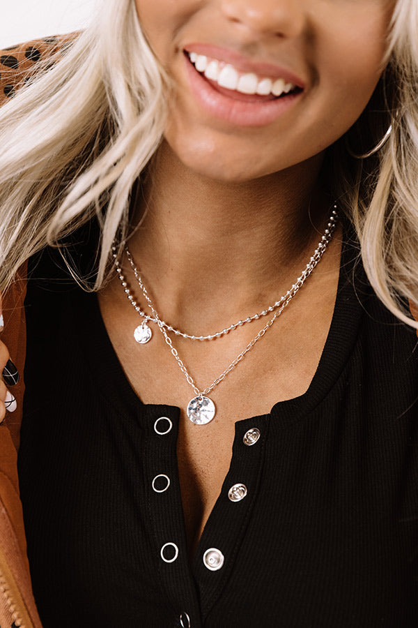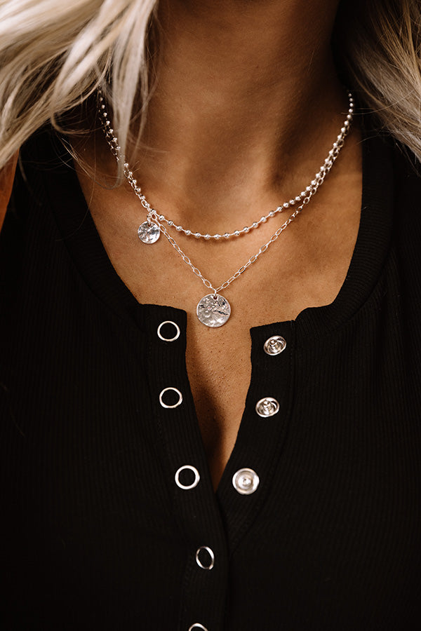 We have no doubt you will be feeling gorgeous when you accessorize with this darling silver necklace featuring a shorter bead chain with a small circle charm and a longer dainty link chain with a larger textured circle charm!
