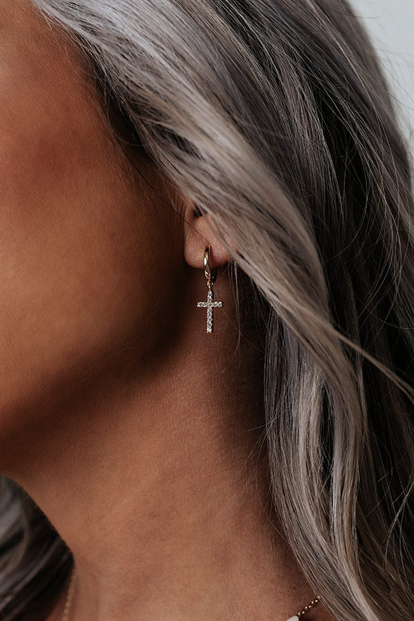 We have no doubt you will be feeling your best when you accessorize with these darling earrings featuring huggie hoops with small dangling gold crosses that have rhinestone detailing!