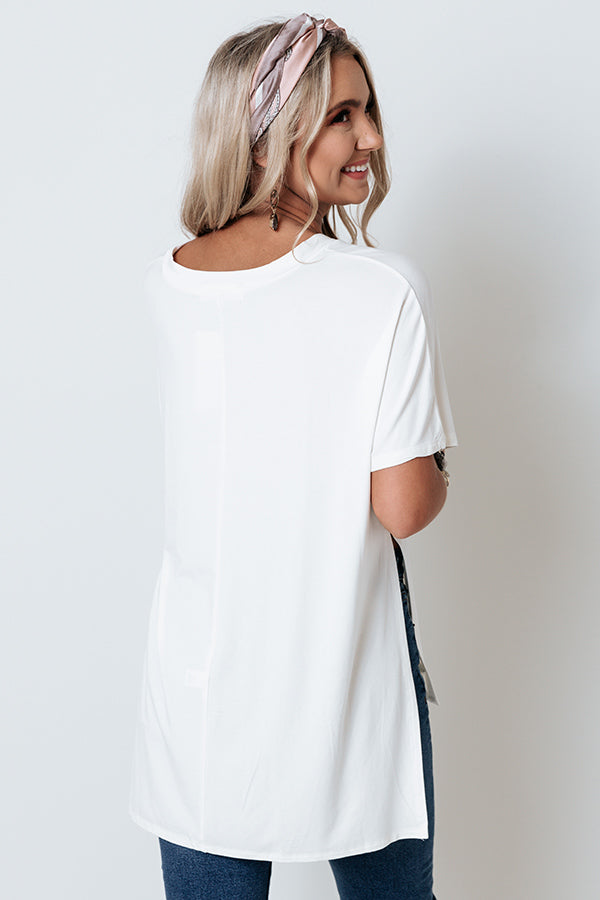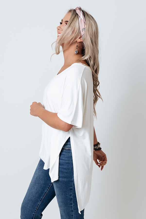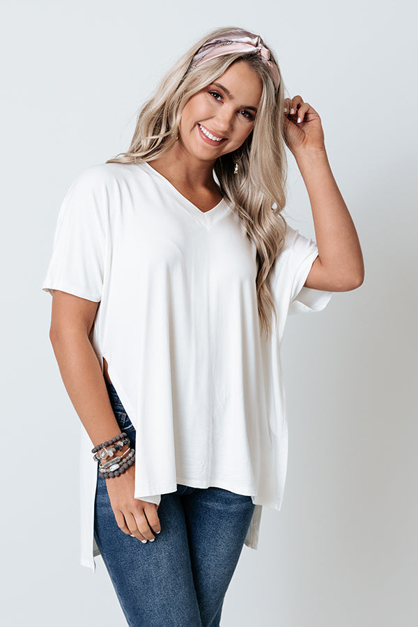 We have no doubt you will feel sparks when you see how cute this timeless ivory hued shift tee is with its soft lightweight and flowy material, v-cut neckline, short loose sleeves, and ultra draped silhouette that falls into a straight hemline with high accent side slits! Measurements