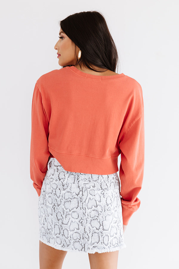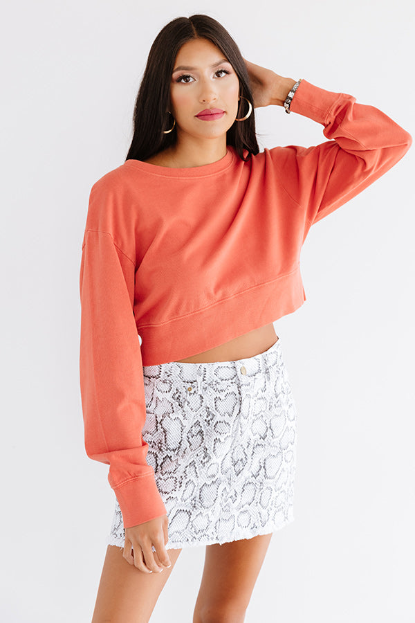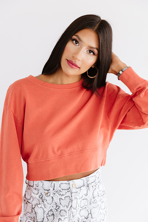 Keep it simple in our versatile tangerine colored "Feeling Zen" sweatshirt featuring soft lightweight material, a high rounded neckline, long loose sleeves with fitted cuffs, and a relaxed silhouette that falls into a straight cropped hemline! We have styled this casual cutie with a snake print skirt, trendy white sneakers, and a black faux leather backpack, but you can also wear it with some distressed ankle skinnies, "The Allen Wedge in Coral," and our "CEO Of Chic Sunnies in White!"