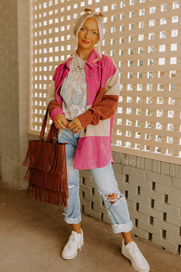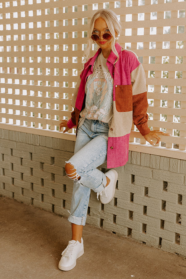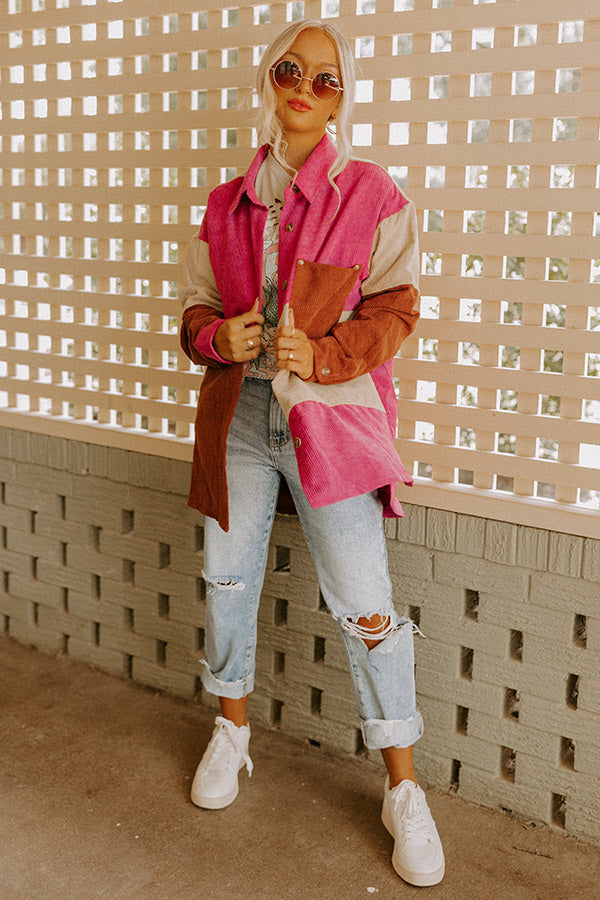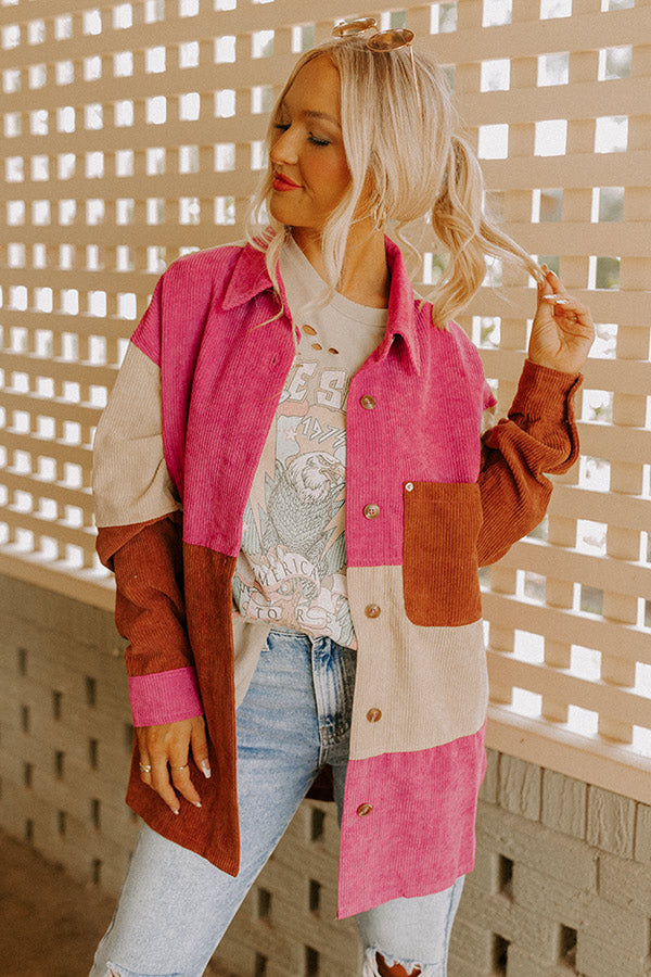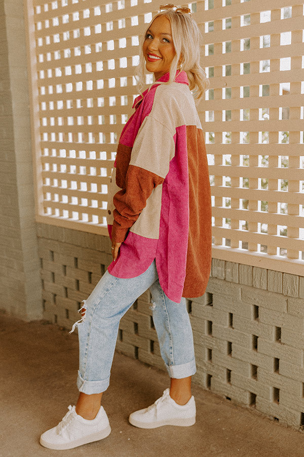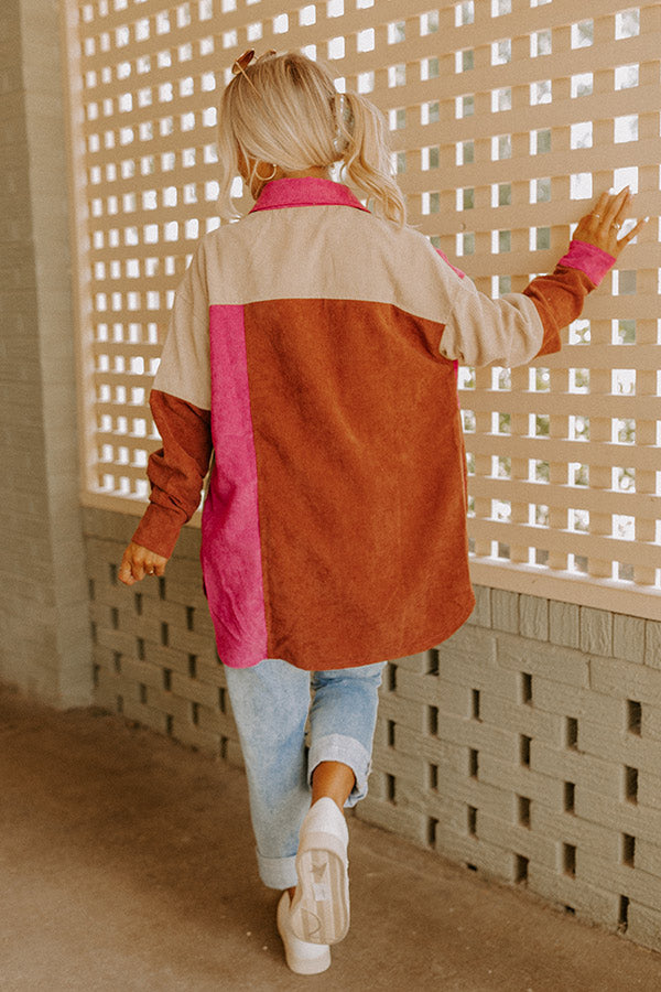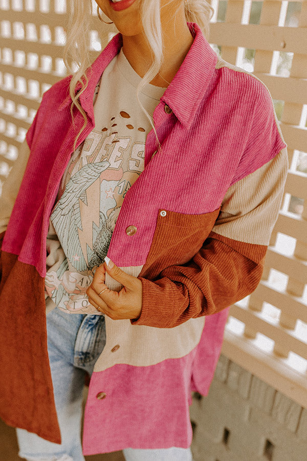 Cozy up in our adorable 'Felt The Chill' top featuring trendy corduroy material with beige, rust, and vineyard grape colored color block panels, a button up front with a collared neckline, long loose sleeves with button closure cuffs, a single accent chest pocket, and a relaxed silhouette that falls into a rounded hemline!