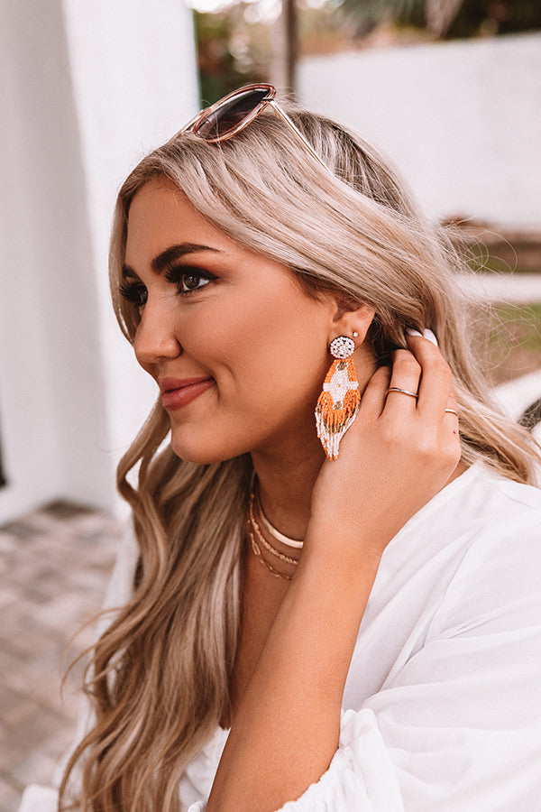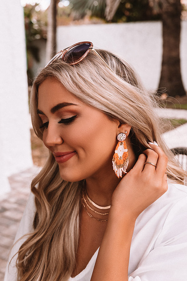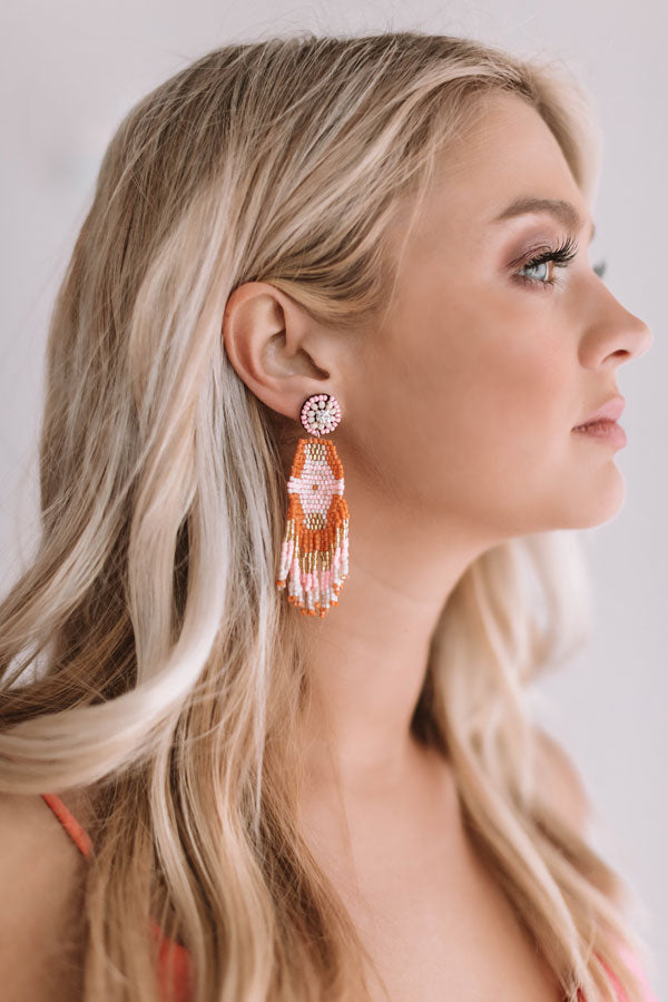 Add a carefree personality to your OOTD by accessorizing with our eye-catching 'Festival Season' statement earrings featuring tangerine, gold, and light pink beaded circle studs and beaded dangling hexagon pendants with beaded tapered tassels!