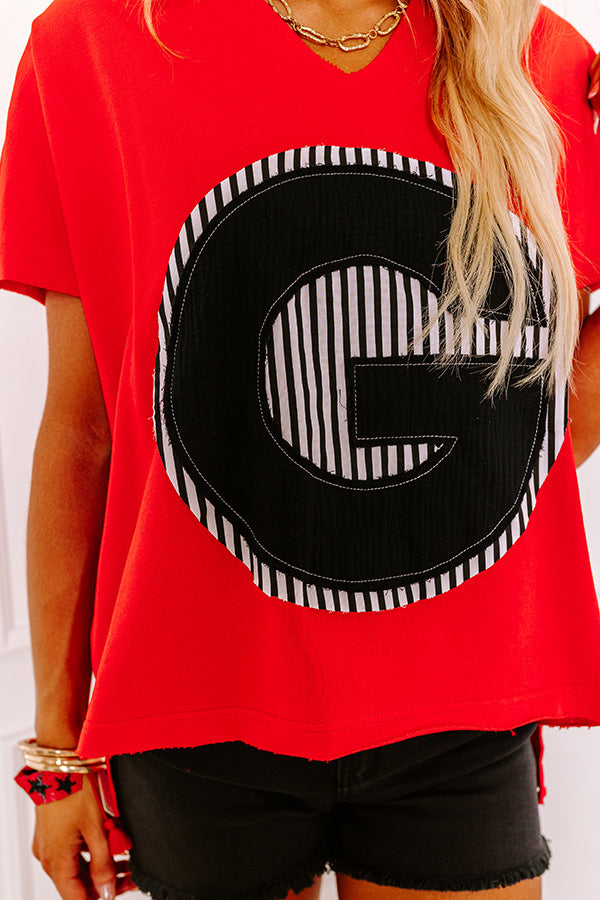 - Get ready to cheer your team on in style with this adorable top! It features a super cute black and white striped 'G' patch on the front, adding a playful touch. Whether you are in the stands or having a blast at a watch party, this top is sure to make you stand out and feel fantastic. Go team!