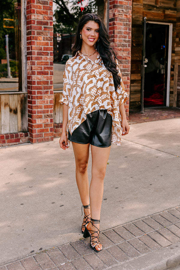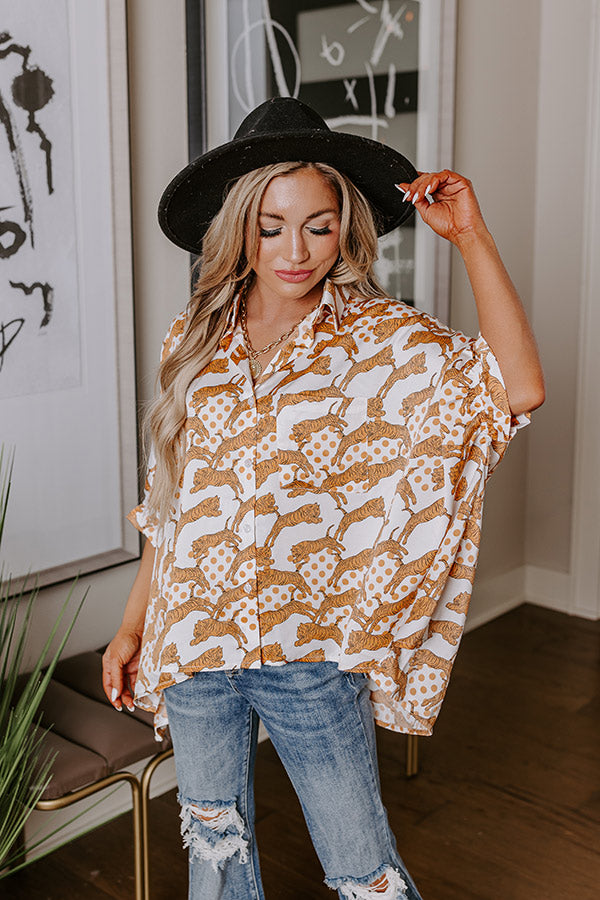 - Lightweight material with a black and orange hued dot and tiger print pattern and a satin finish